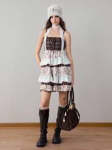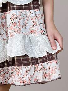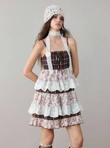 ROMWE Avant Women's Retro Pastoral Style Plaid & Floral Lace Patchwork Bow Tie Strap Layered Ruffle Hem Slip Dress