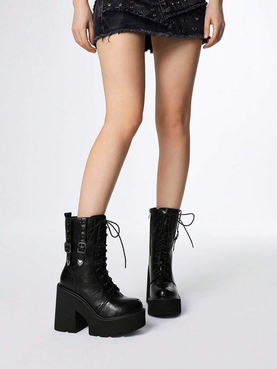 Women's Retro Thick Platform Goth Style Ankle Boots, Dark Metal Double Buckle Decor High Heel Punk Rock Side Zipper Lace-Up Mid-Calf Boots