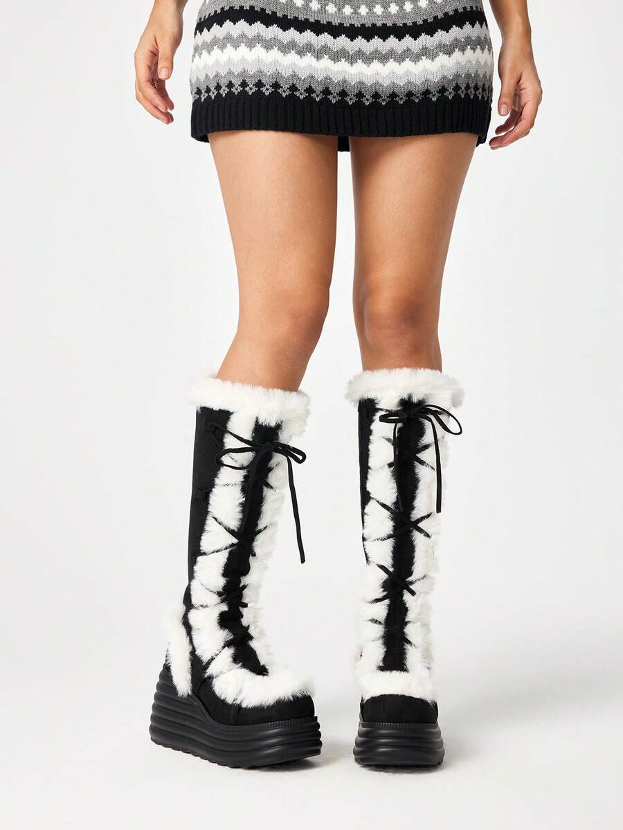 Women's Round Toe Punk Lace-Up Side Zipper Platform Thick Sole Fur Lined Knee-High Boots, Outdoor Fashion, Autumn/Winter New Arrival