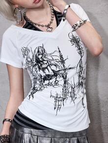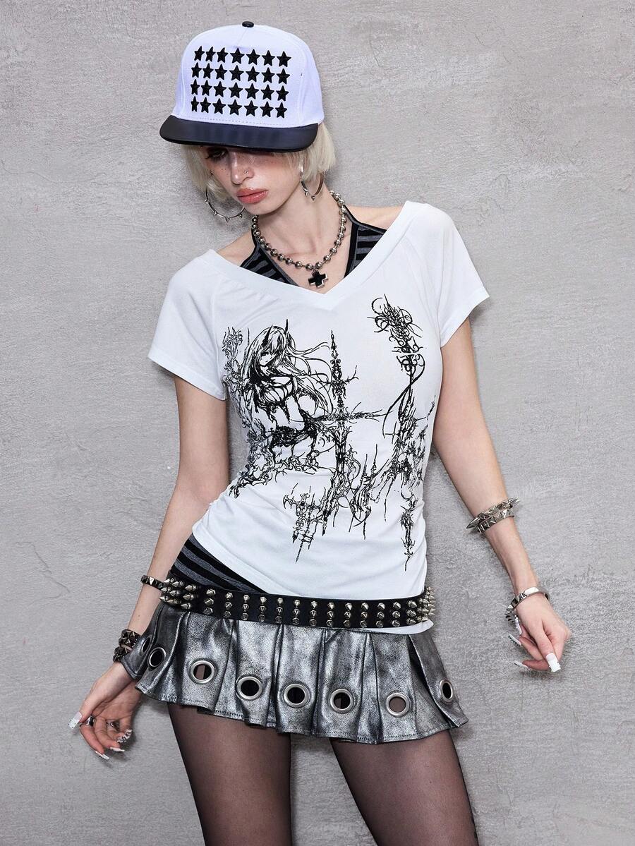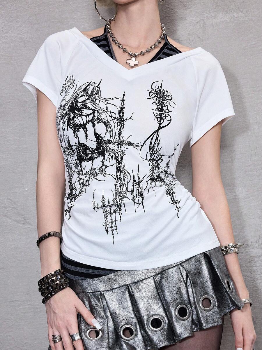 ROMWE Avant Women's Sexy Y2K 2 In 1 V-Neck Striped Contrast Color Halter Tie Bow T-Shirt, White