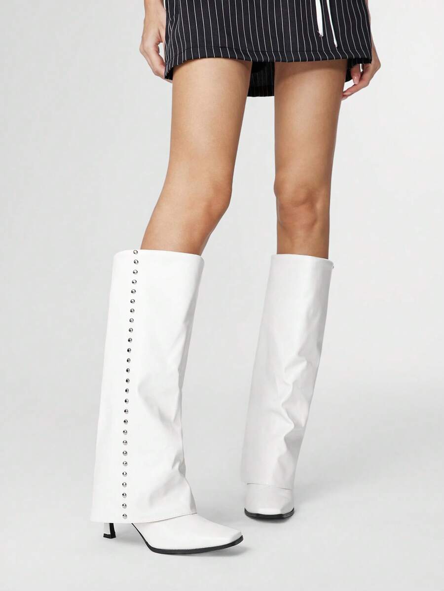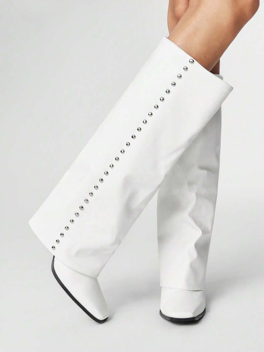 Grunge Punk Women's Studded Decor Fashion White Square Toe Slim Heel Over-The-Knee Boots For Christmas