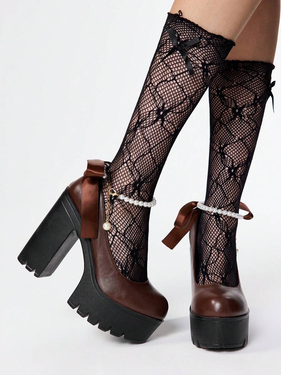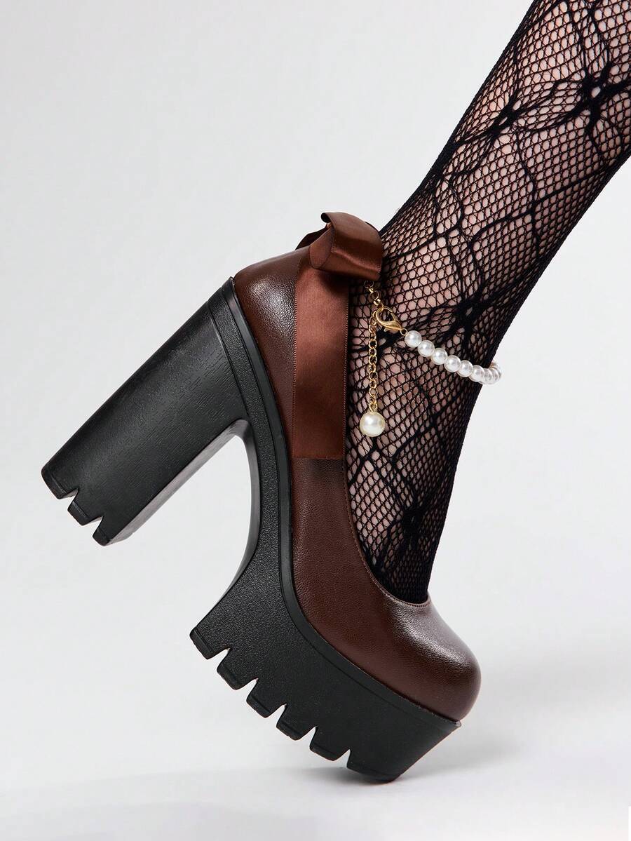 Goth Women's Thick Sole Chunky Heel Pumps, Fashion Solid Color Pearl Buckle Lace Bow Decor High Heel Mary Jane Shoes, Suitable For Party, Outing, Date