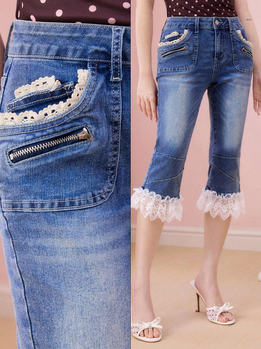 ROMWE Avant Women's Vintage Contrast Lace Waist Belt Decor Skinny Super Low Waist 7/8 Length Jeans