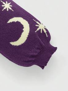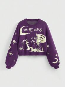 Fairycore Women's Vintage Halloween Black Cat, Star, Moon Jacquard Knit Crew Neck Basic Pullover Sweater