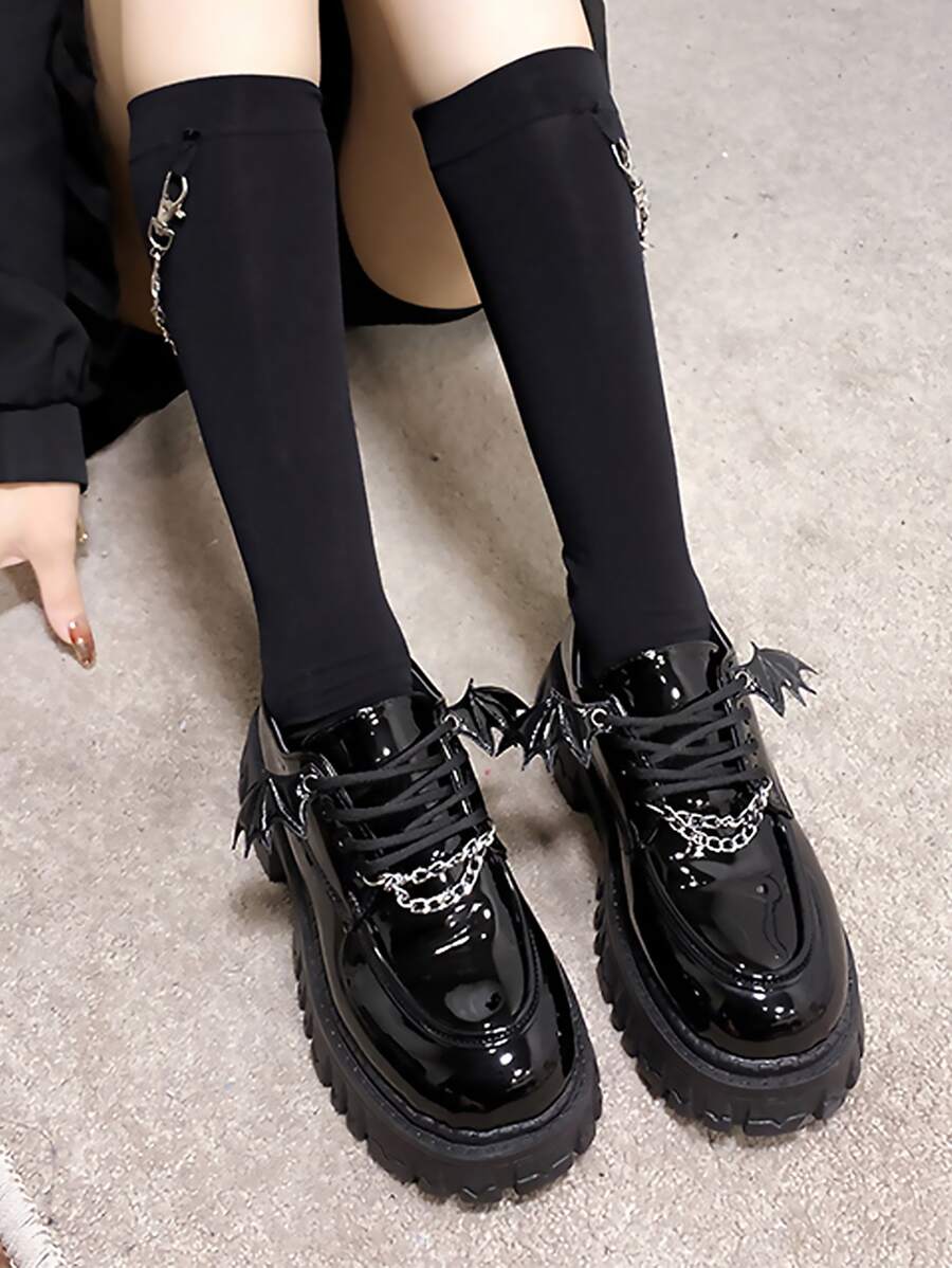 Women Bat Wing & Chain Decor Lace-Up Front Flatform Punk Black Oxford Shoes Fall New Year Holiday Valentines