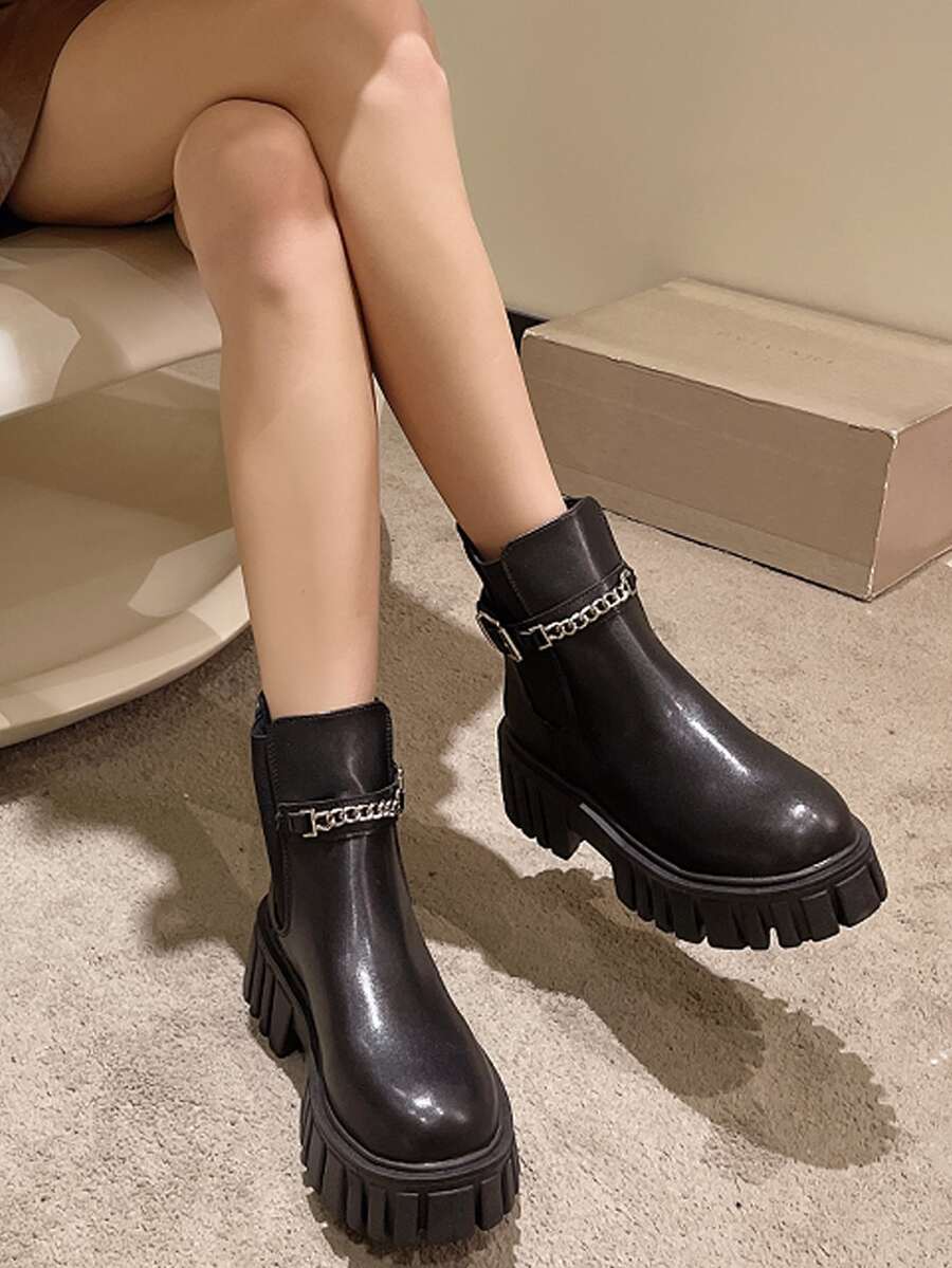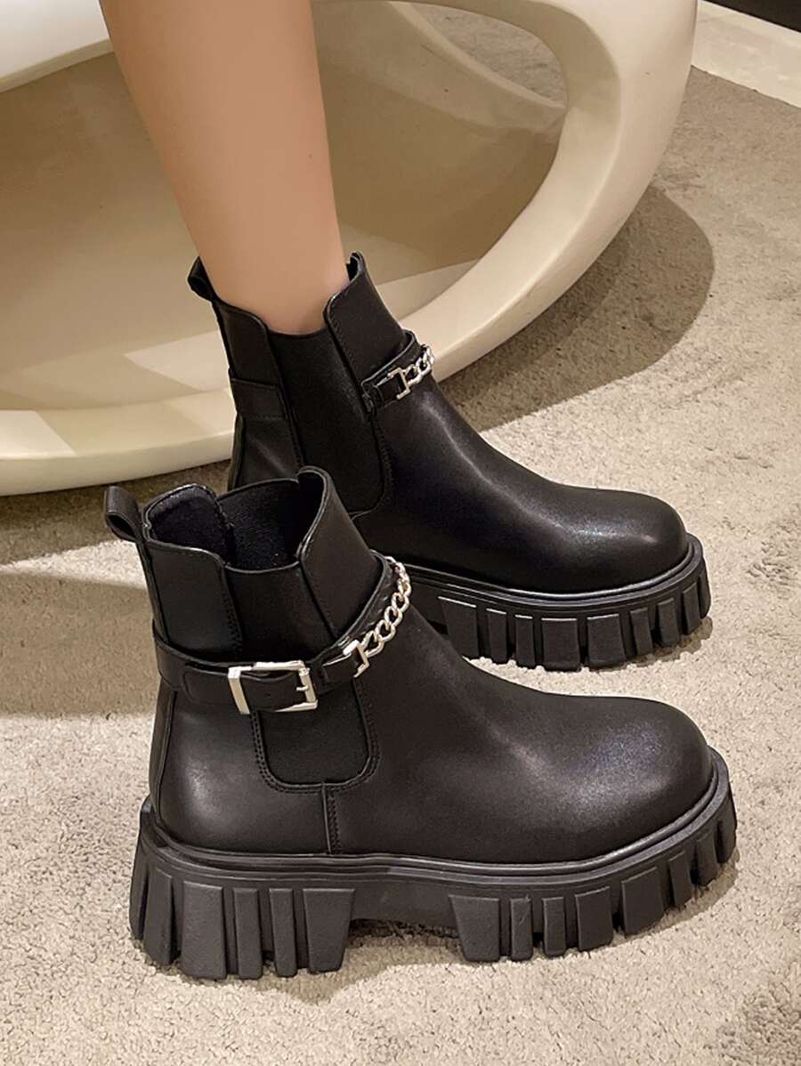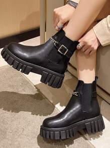 Women Buckle & Chain Decor Slip-On Chelsea Boots, Punk Black Fashion Boots