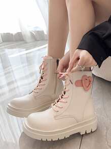 Women Buckle Decor Lace-up Front Fashion Boots, Preppy Beige Combat Boots