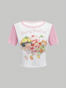 Women Casual Cartoon Character & Letter Print Patchwork Colorblock Polka Dot Short Sleeve Fitted T-Shirt, Summer