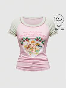 Women Casual Cute Cartoon Character & Slogan Print Raglan Sleeve Contrast Stitch Fitted T-Shirt, For Summer