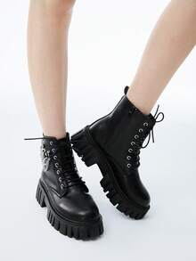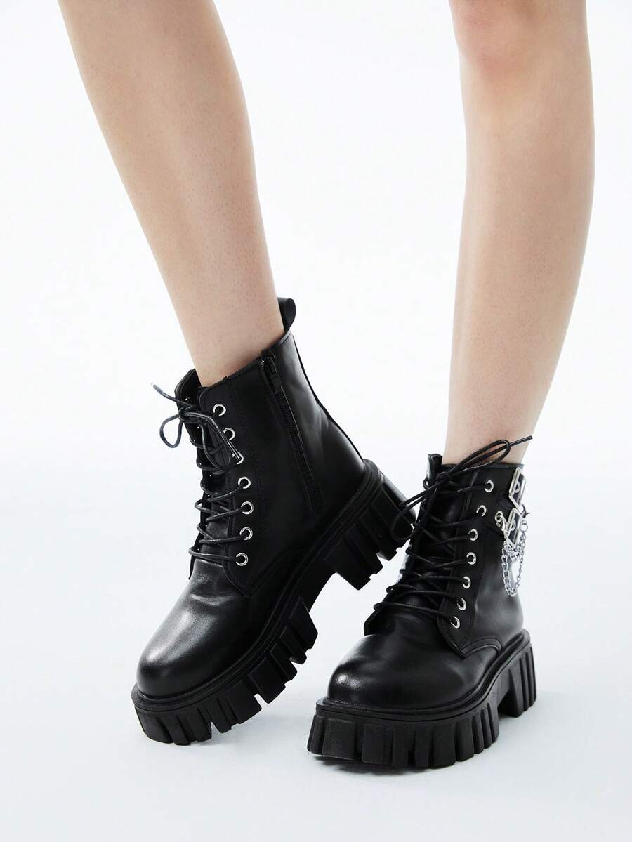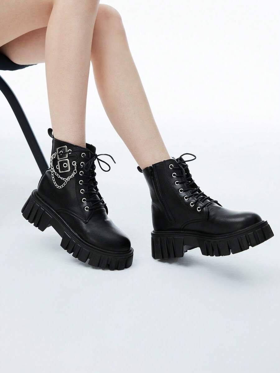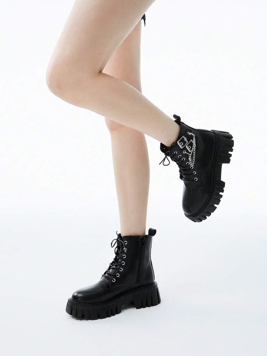 Goth Women Chain Decor Lace-up Front Round Toe Combat Boots, Punk Outdoor Fashion Boots