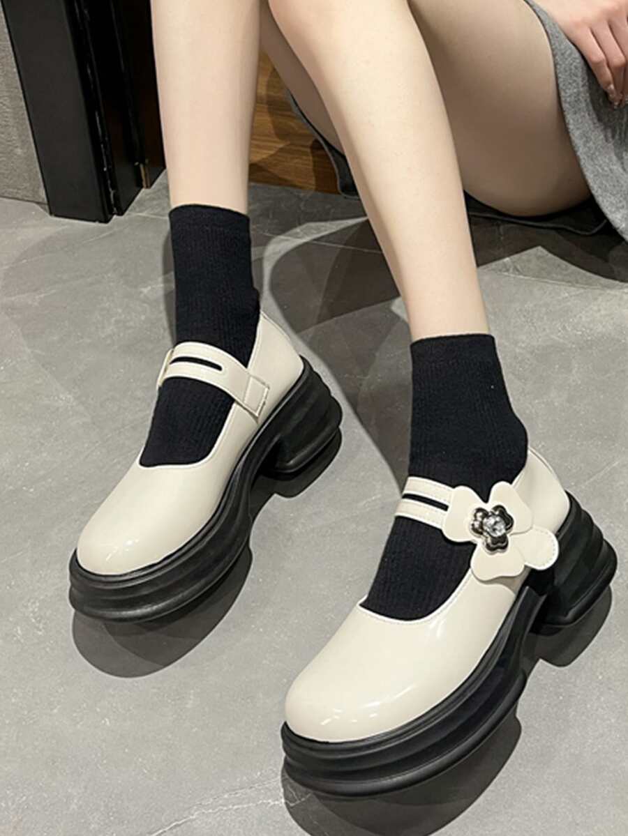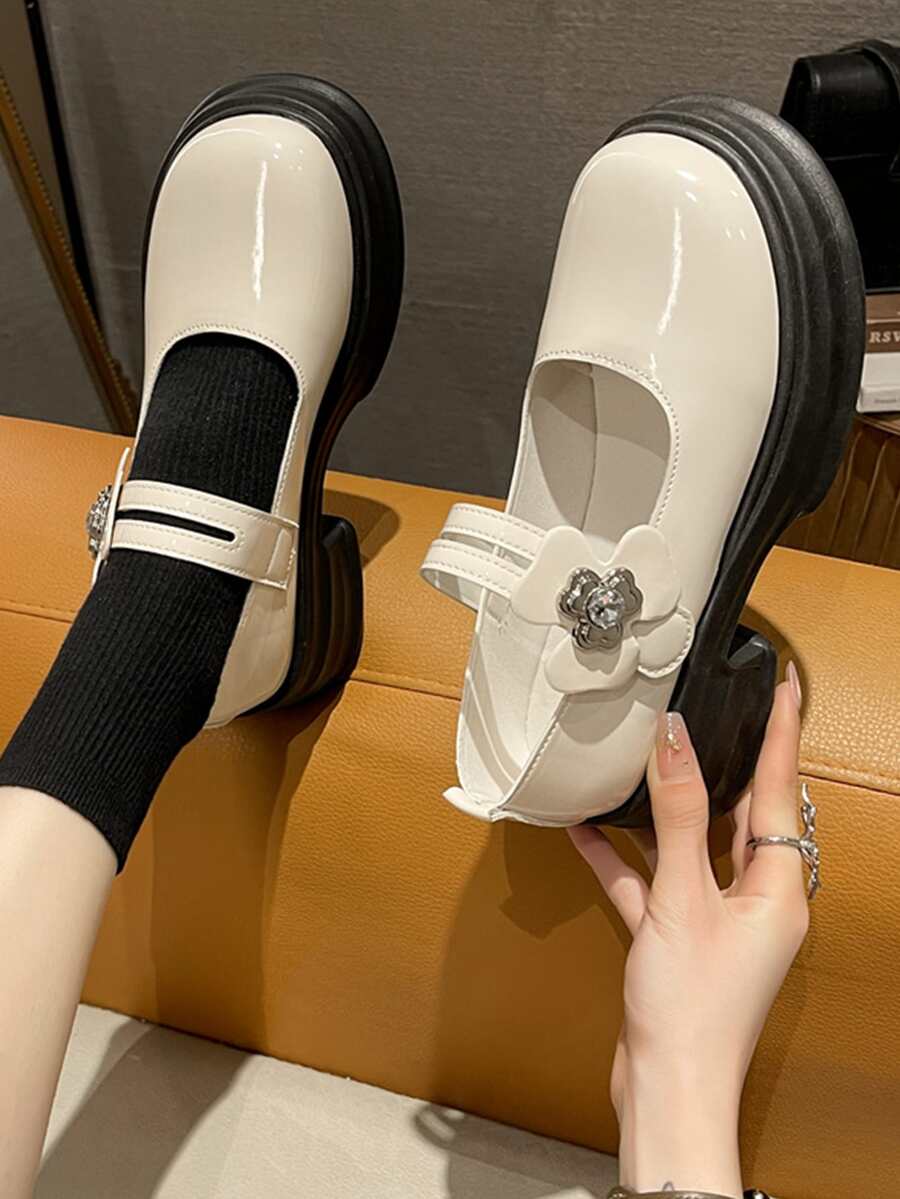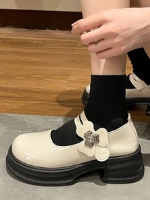 Women Clover & Rhinestone Decor Platform Mary Jane Shoes, Preppy Beige Artificial Patent Leather Platform Shoes