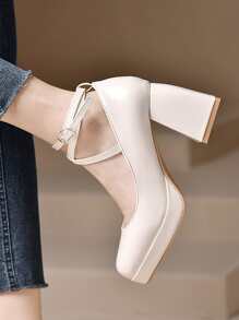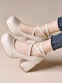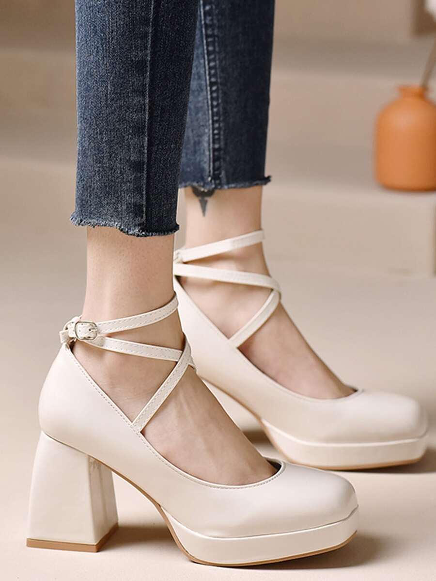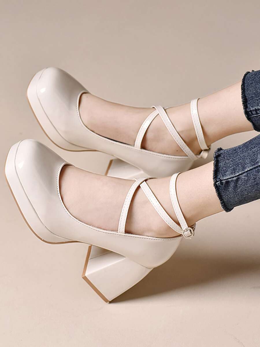 Women Criss Cross Square Toe Ankle Strap Chunky Heeled Pumps, Elegant Beige Artificial Patent Leather Pumps