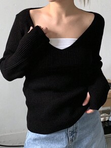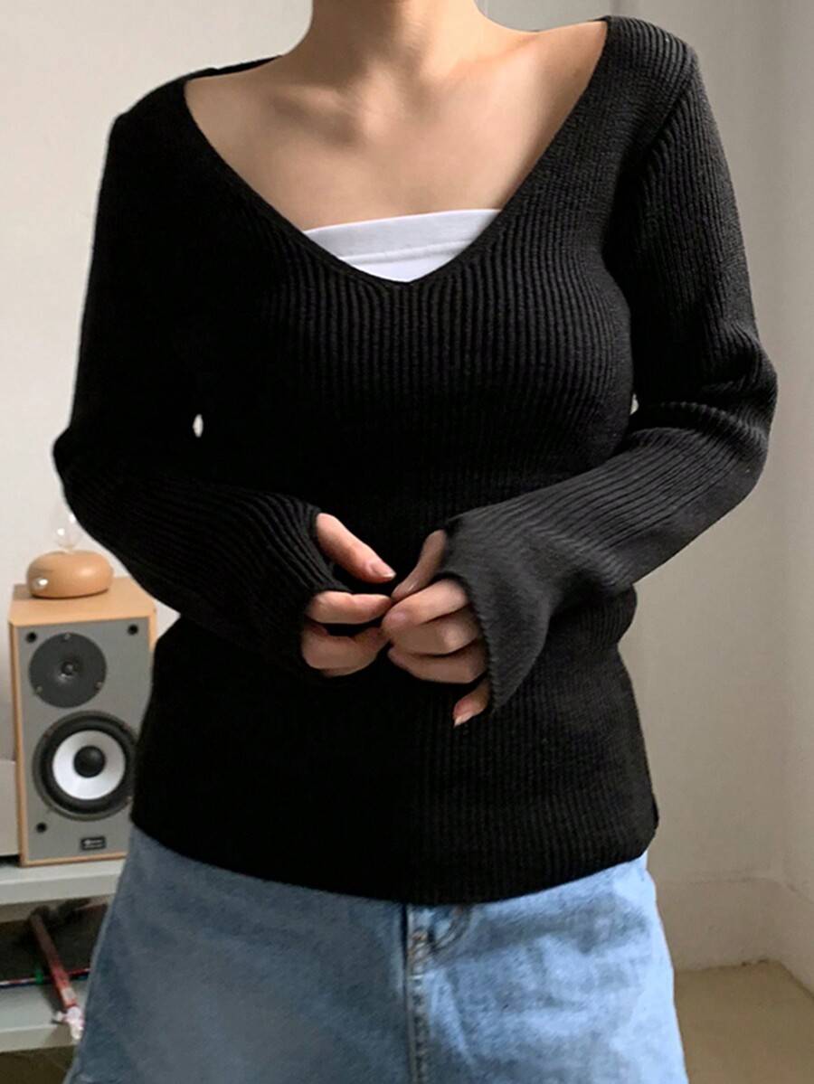 Women Deep V-Neck Solid Color Casual Long Sleeve Slim Fit Sweater