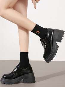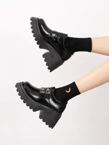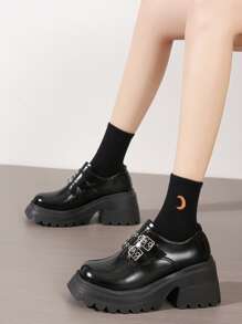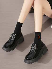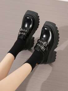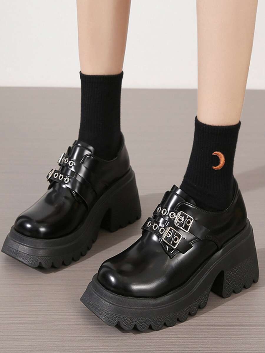 Women Eyelet Detail Buckle Decor Platform Loafers, Punk Black Platform Shoes