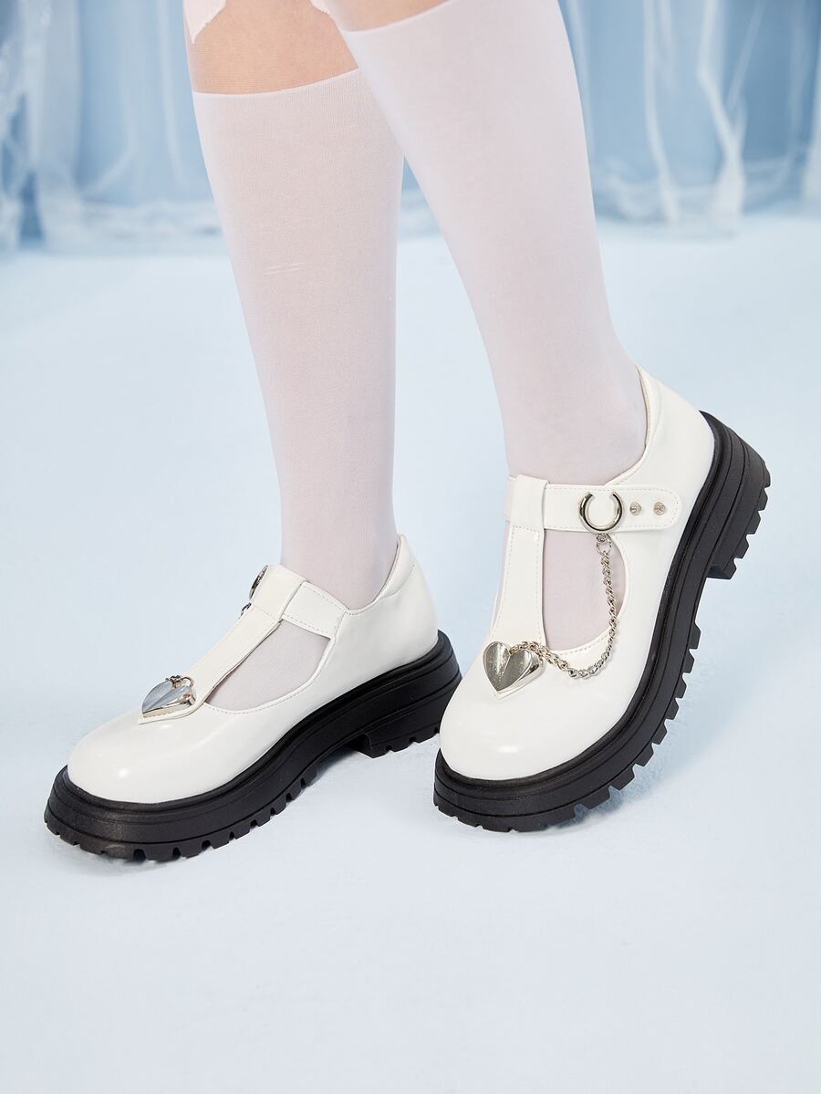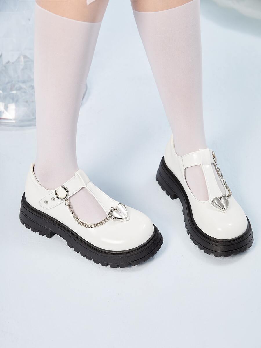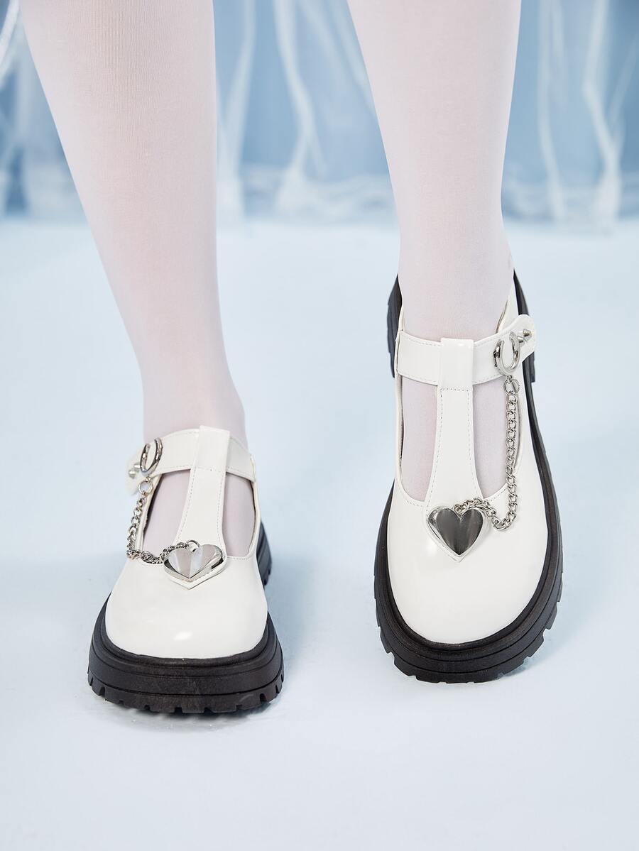 Women Heart & Chain Decor Flatform Shoes, Punk Mary Jane Shoes White