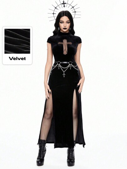 Gothic Palace Style Sexy Contrast Lace V-Neck Pendant Cross Chain High Slit Dress For Women, Halloween Clothes