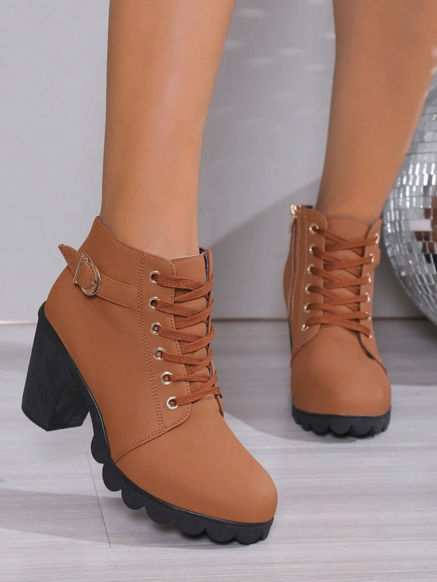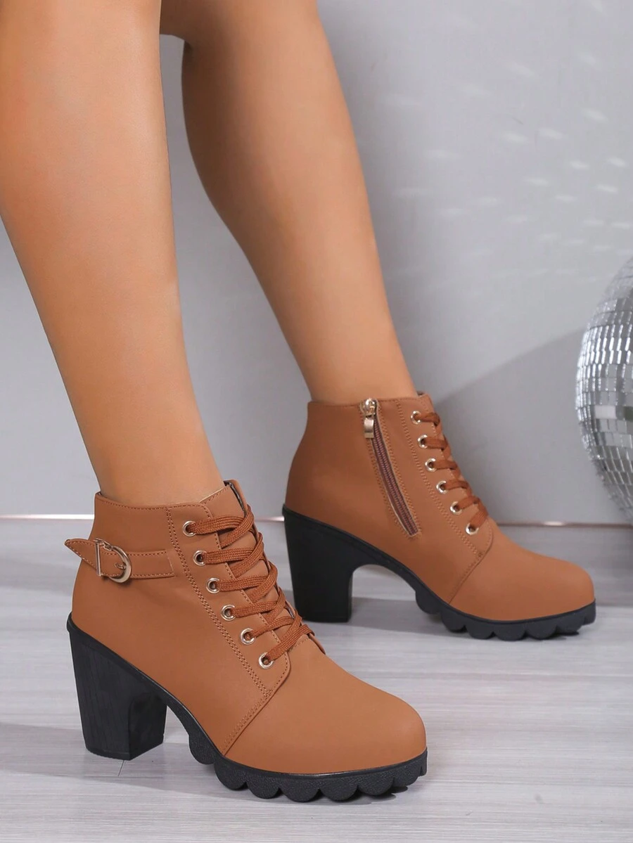 Women'S Vintage Square Toe Brown High Heeled Fashion Boots For 2024 Spring And Autumn