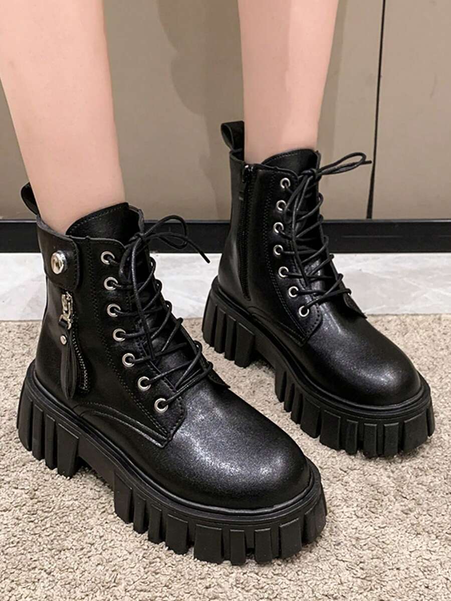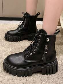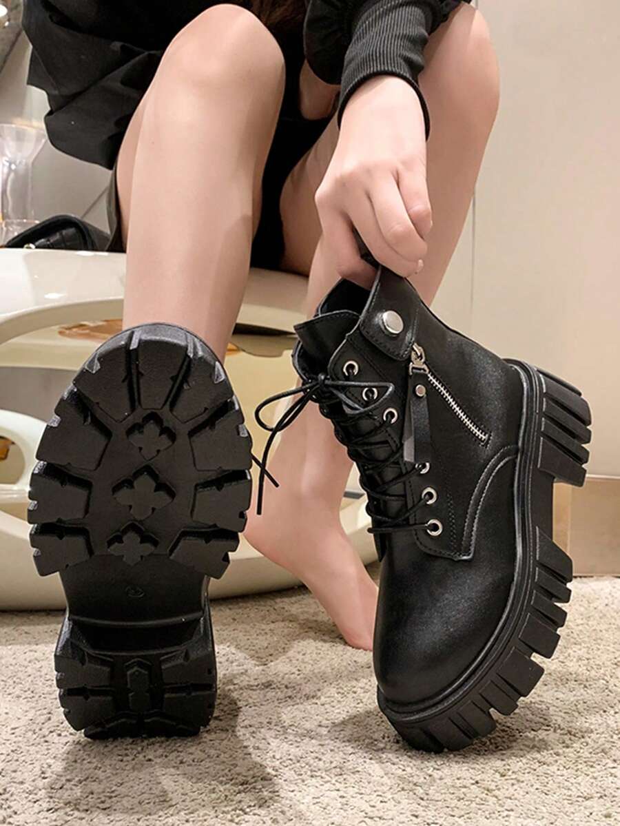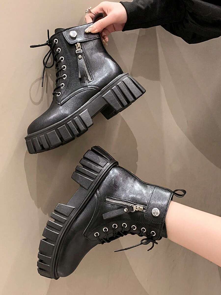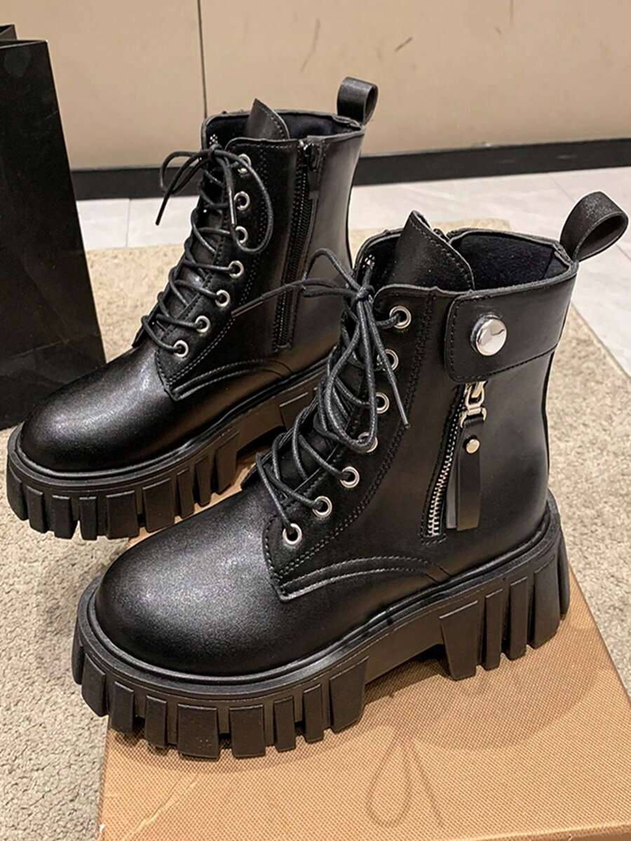 Women Side Zip Lace Up Front Round Toe Combat Boots, Cool Outdoor Fashion Boots