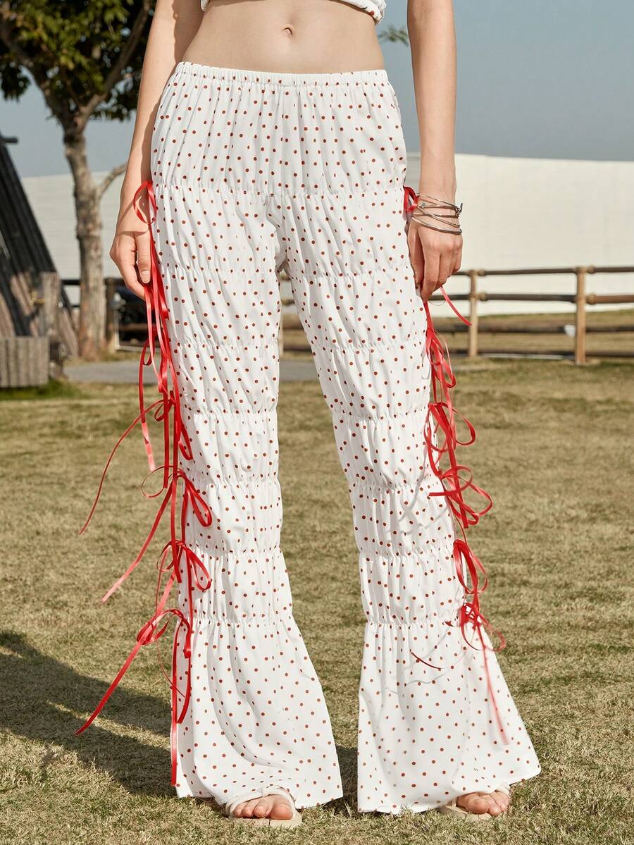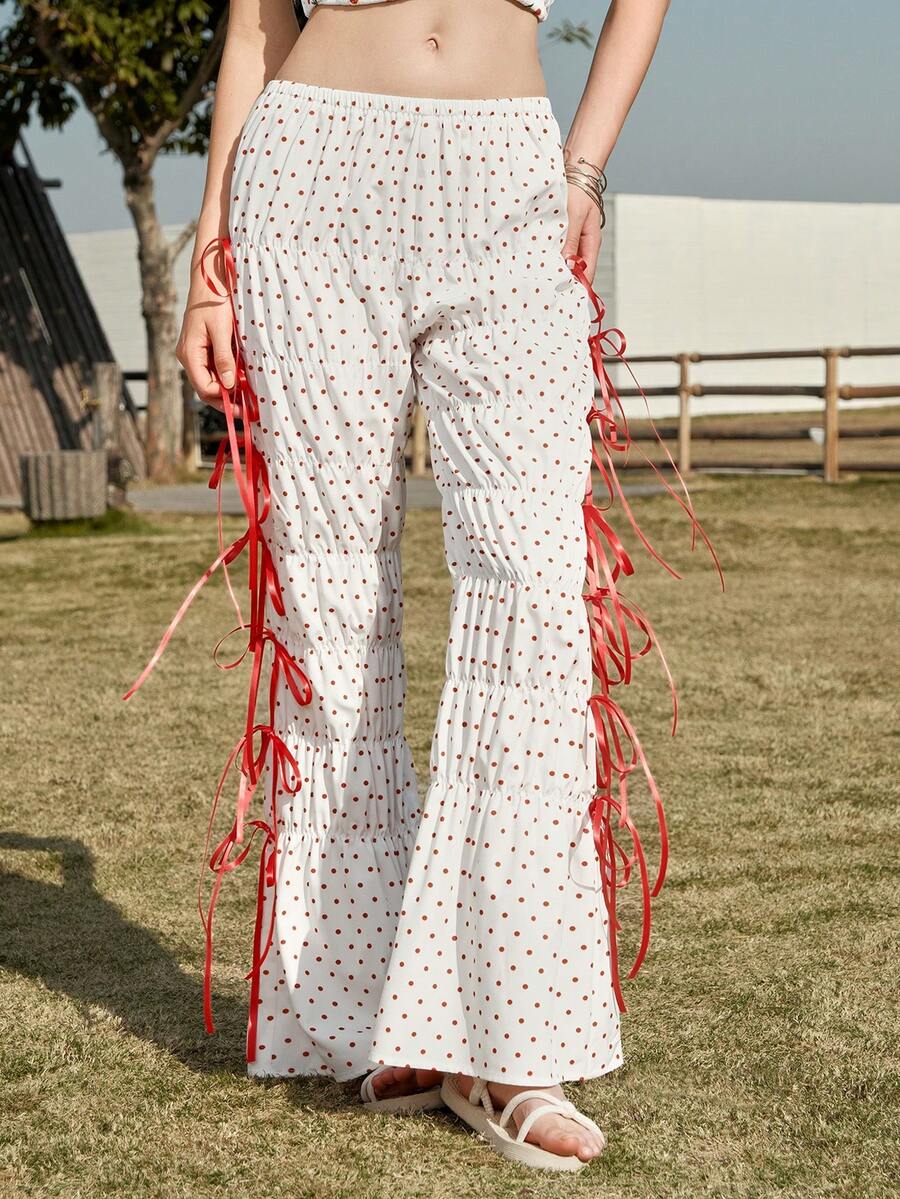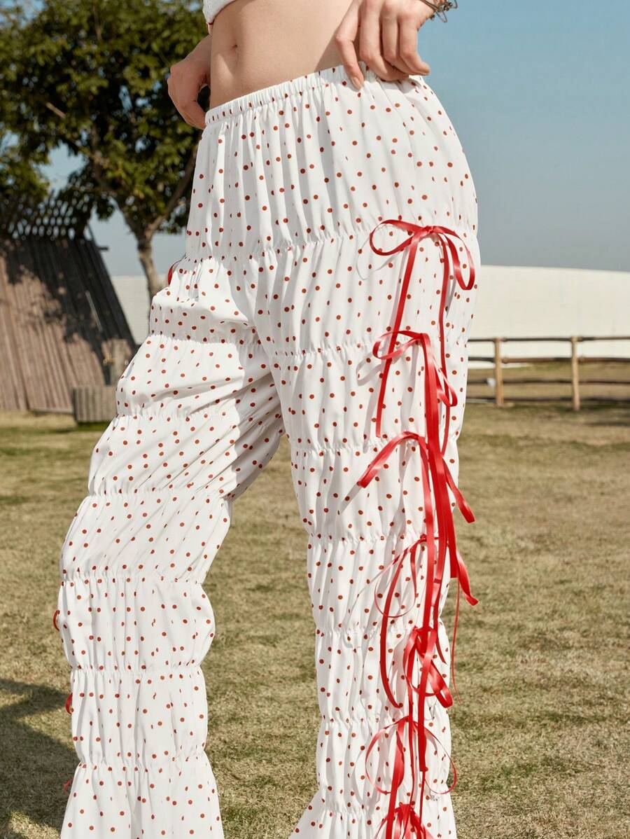 Women's Casual Bowknot & Polka Dot Ruched Trousers