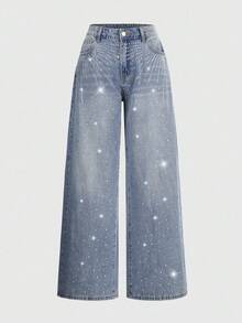 Women's Casual Loose Button Pocket Rhinestone Embellished Loose Fit Jeans