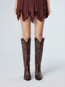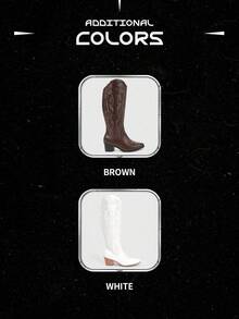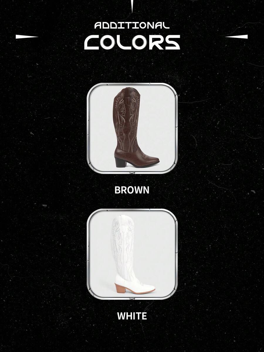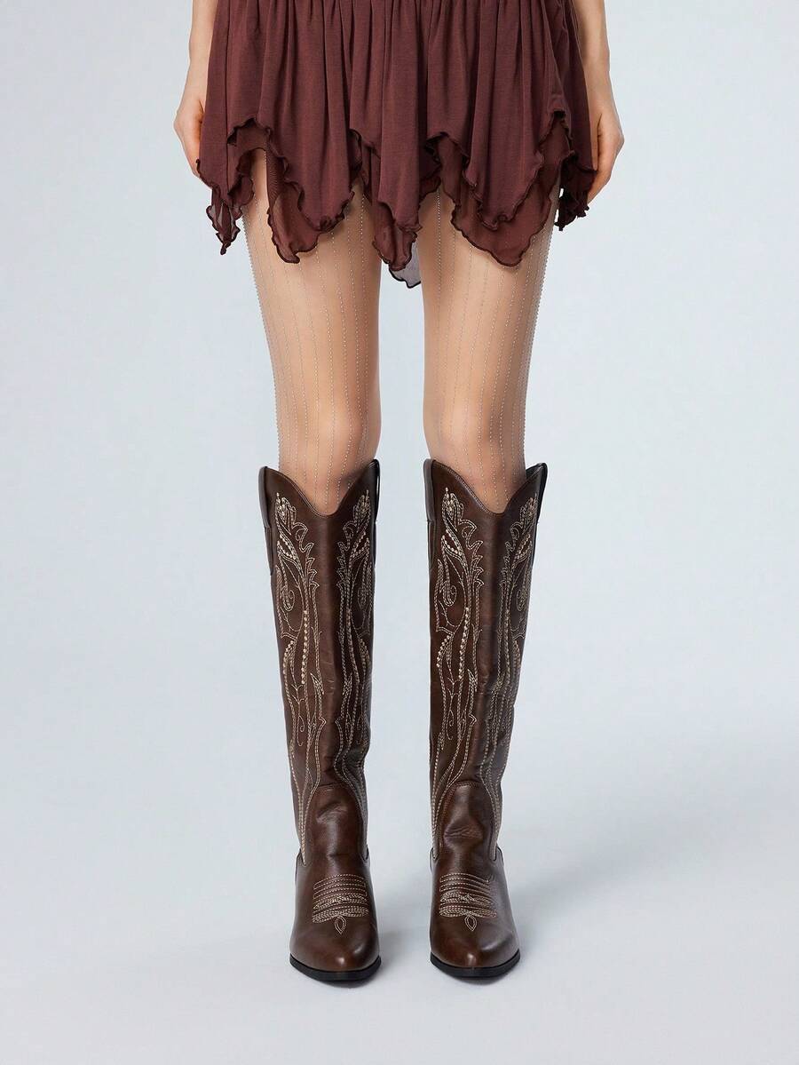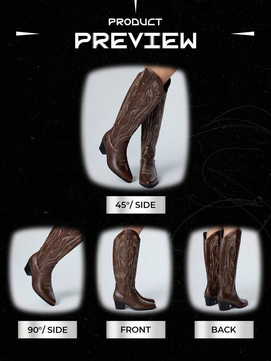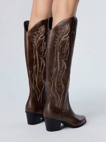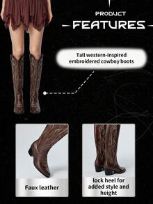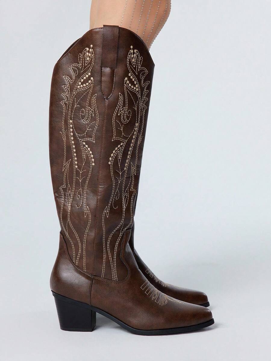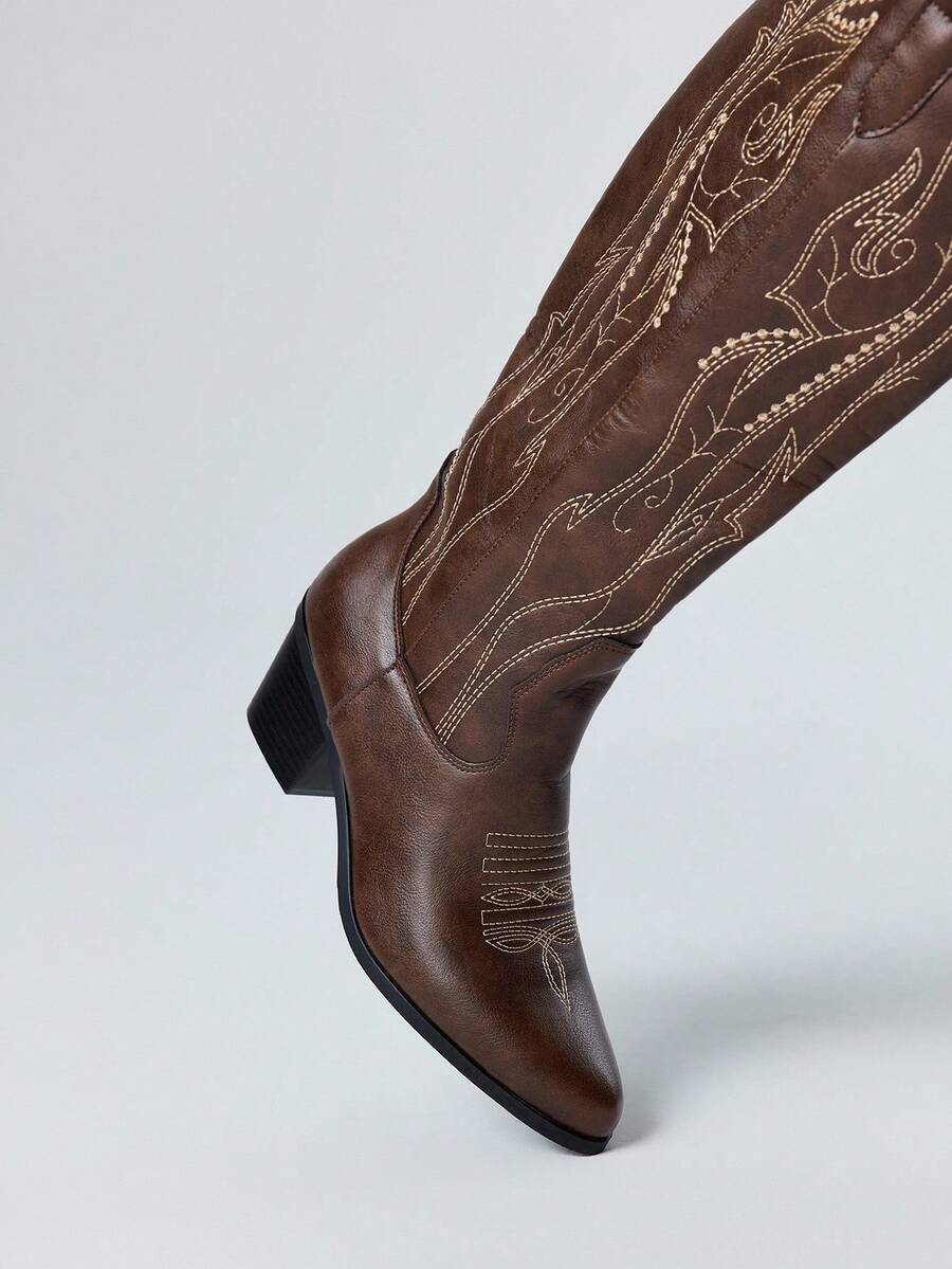 Women's Coffee Brown Embroidered Western Boots, Leather Surface, Outdoor Fashion Slip-On Over-The-Knee Boots, Spring And Autumn New Arrival