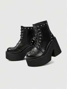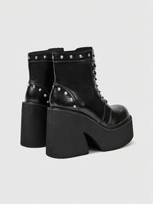 Women's Comfortable Retro Platform Ankle Boots, Gothic Round Toe Rivet Embellished Thick Sole Punk Style Leather Chunky Heel Booties, Outdoor Commute Party Boots