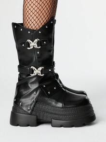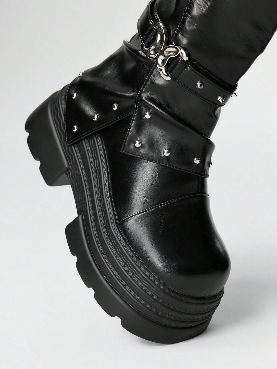 Women's Dark Punk Goth Boots, Black Leather Buckle High-Top Boots, Motorcycle Boots, Platform Chunky Heel Mid-Calf Boots