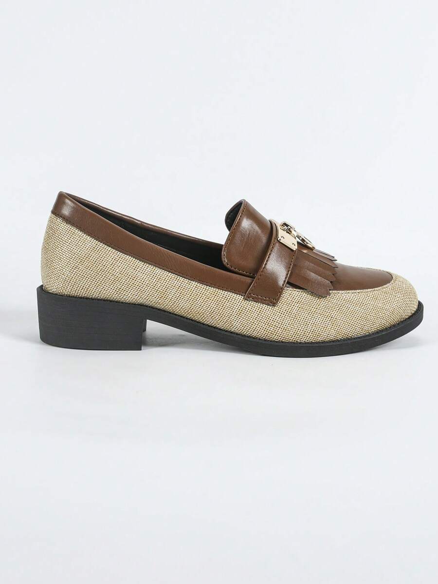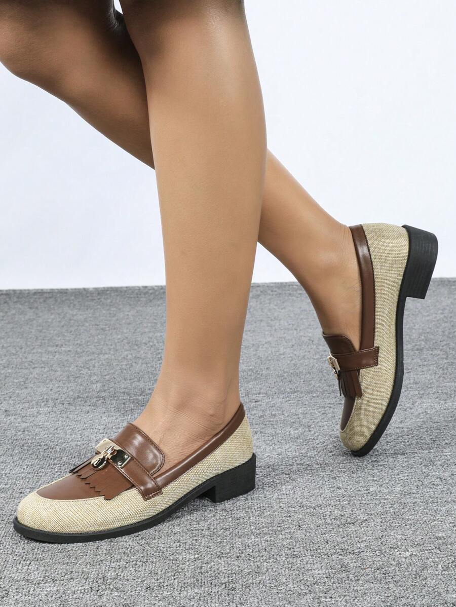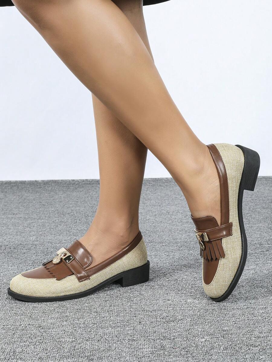 Women's Fashion Versatile Black Loafers Chunky Heels Slip-On Casual Shoes, New Spring/Autumn Metal Lock Tassel Decor Round Toe Outdoor Plus Size New Year Holiday