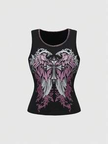 Women's Fashion Wing & Cross Print Round Neck Camisole, Summer
