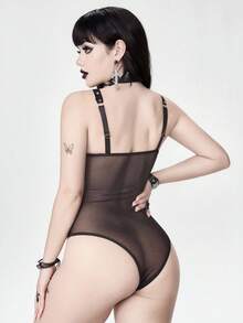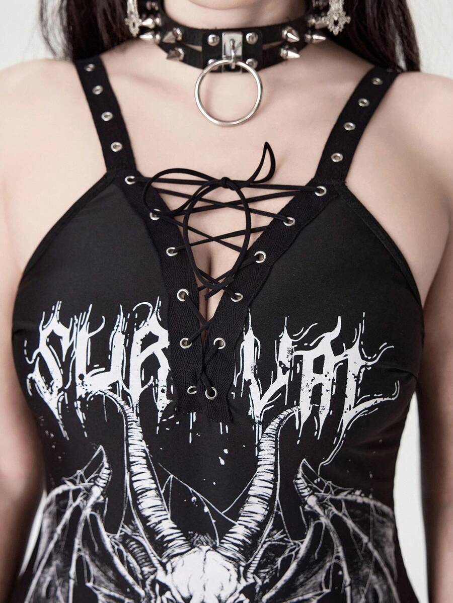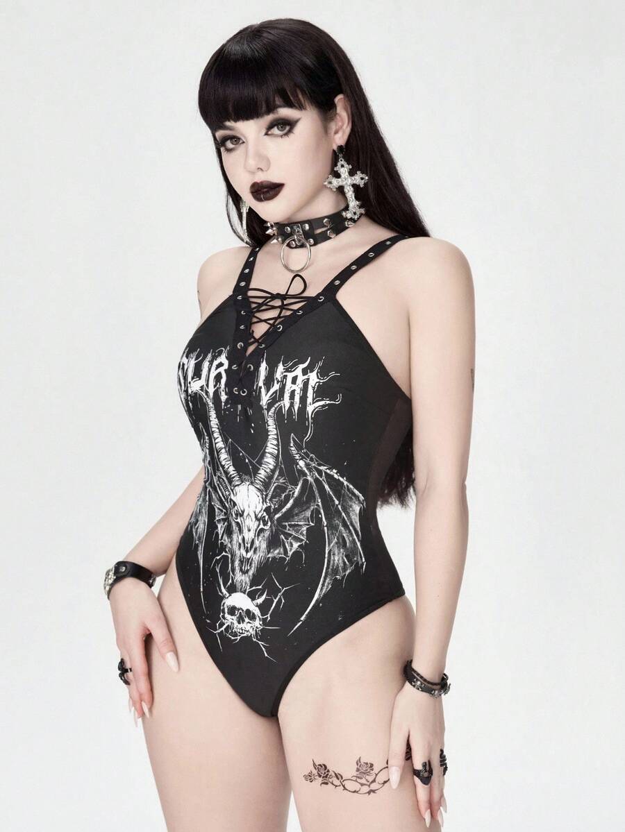 Women's Gothic Skull & Crossbones Print Lace-Up Bodysuit