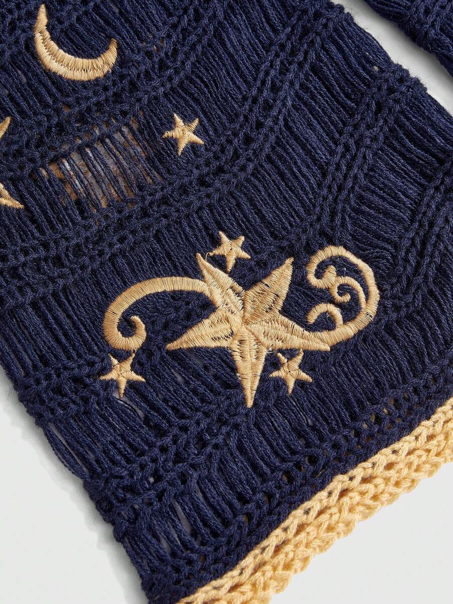 Women's Hippie Boho Moon & Star Embroidery Crochet Flare Sleeve Cardigan