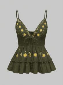 Women's Hippie Embroidered Tie-Front Ruffle Trim Camisole
