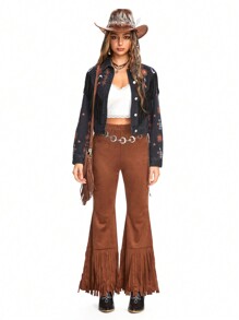 Women's Hippie Sun & Moon Embroidered Fringed Loose Cropped Denim Jacket