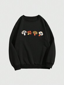 Women's Loose Graphic Print Sweatshirt With Halloween Pumpkin, Mushroom And Ghost Designs , Black Sweatshirt