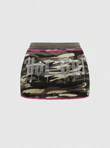 Women's Low Waist Ultra-Short Camouflage Handgun Rhinestone Print Skirt