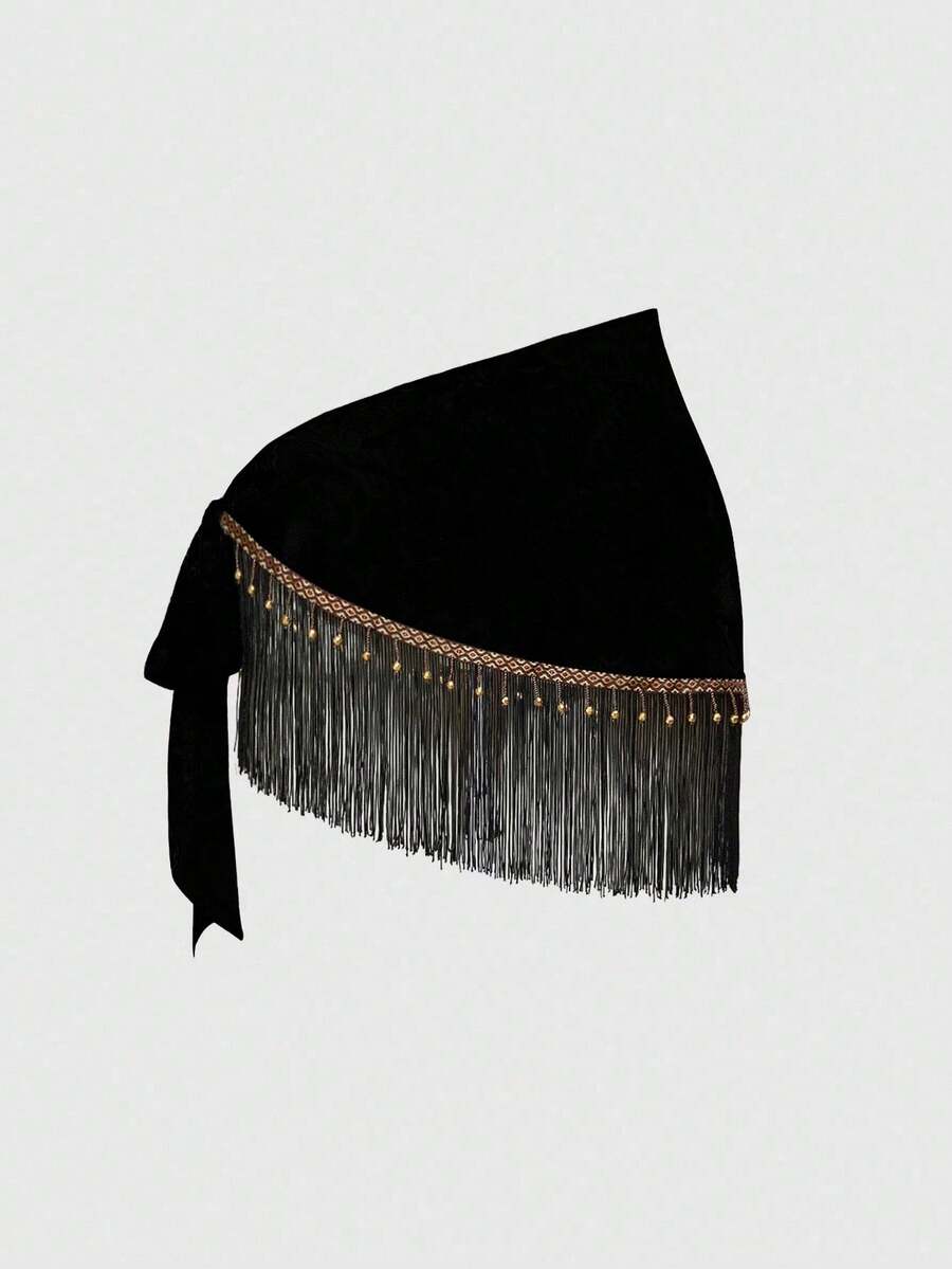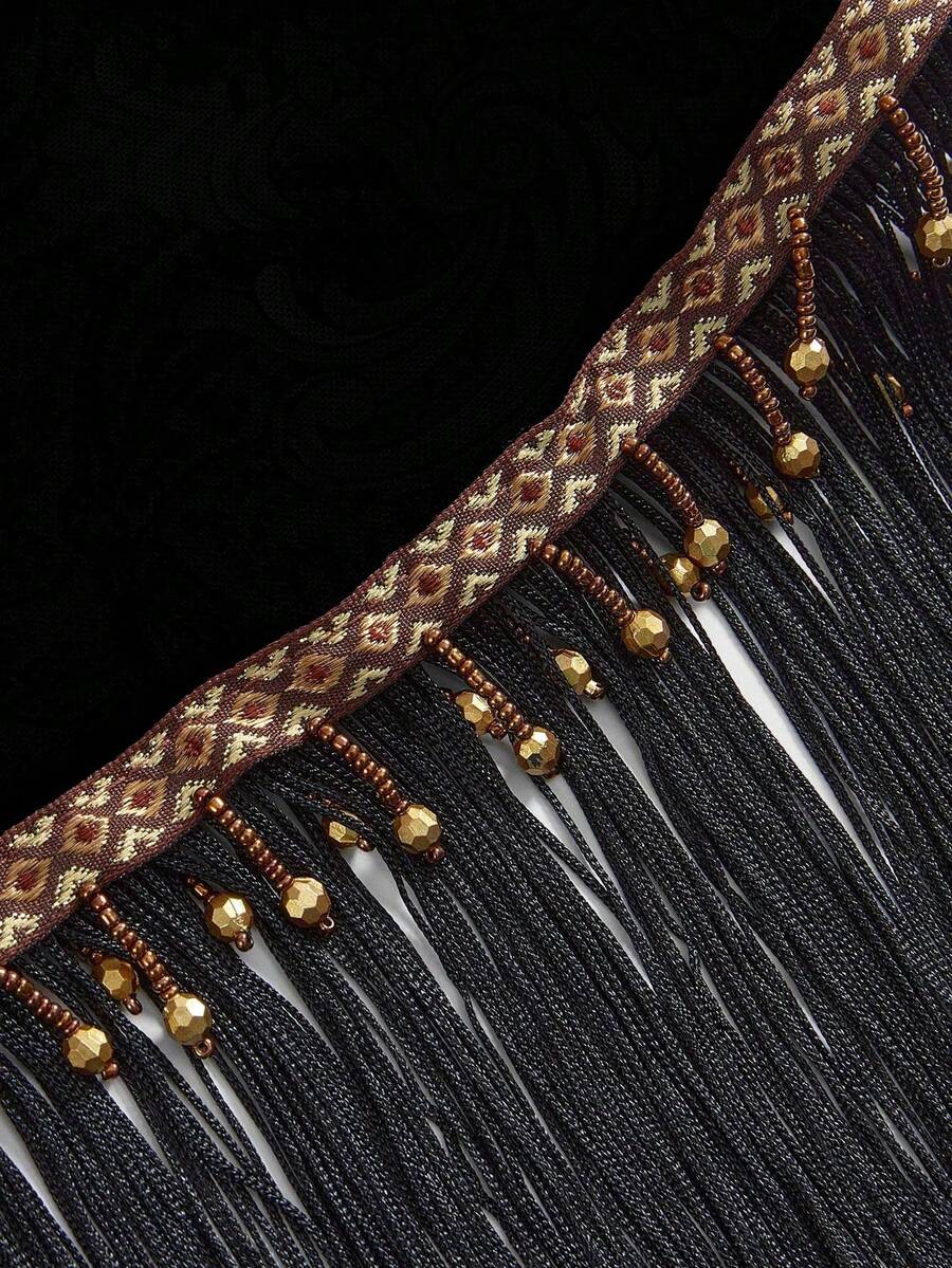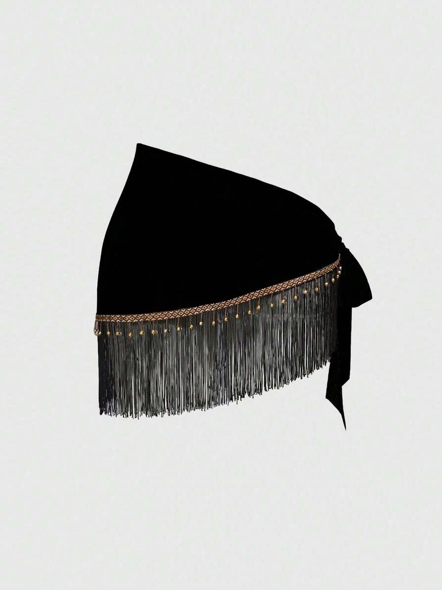 Women's Retro Hippie Western Music Festival Beaded Fringe Hem Drawstring Skirt