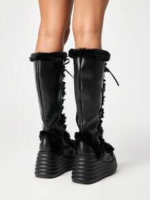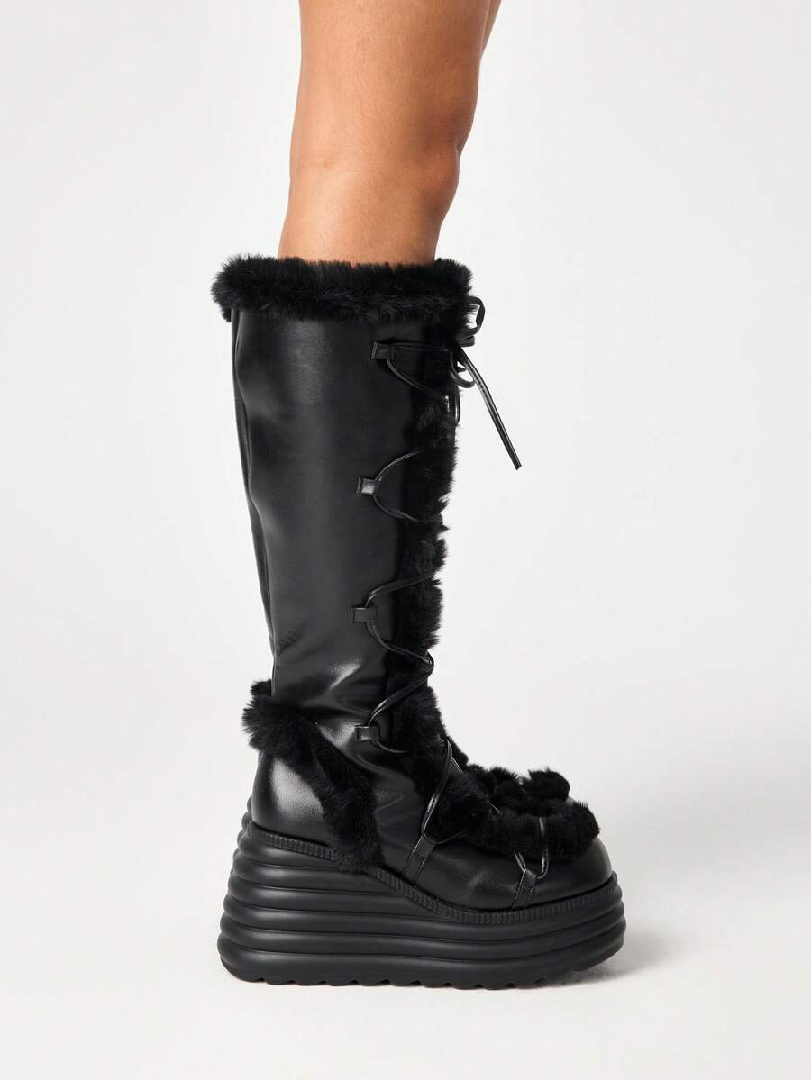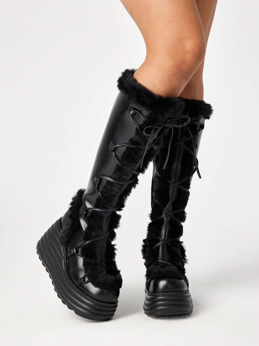 Women's Round Toe Punk Lace-Up Side Zipper Platform Thick Sole Boots With Fur Lining, Outdoor Fashion Over-The-Knee Boots, Autumn/Winter New Arrival For Christmas