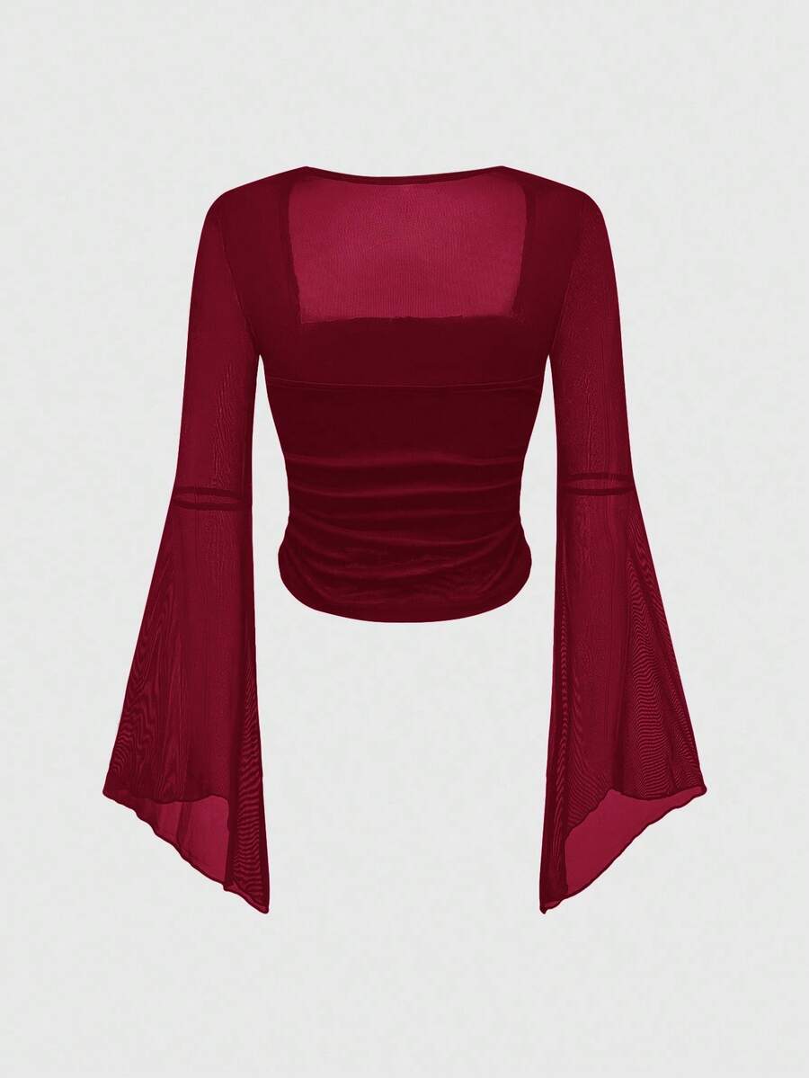 Women's Solid Color Minimalist Mesh Flare Sleeve Long Sleeve Blouse, Everyday Wear