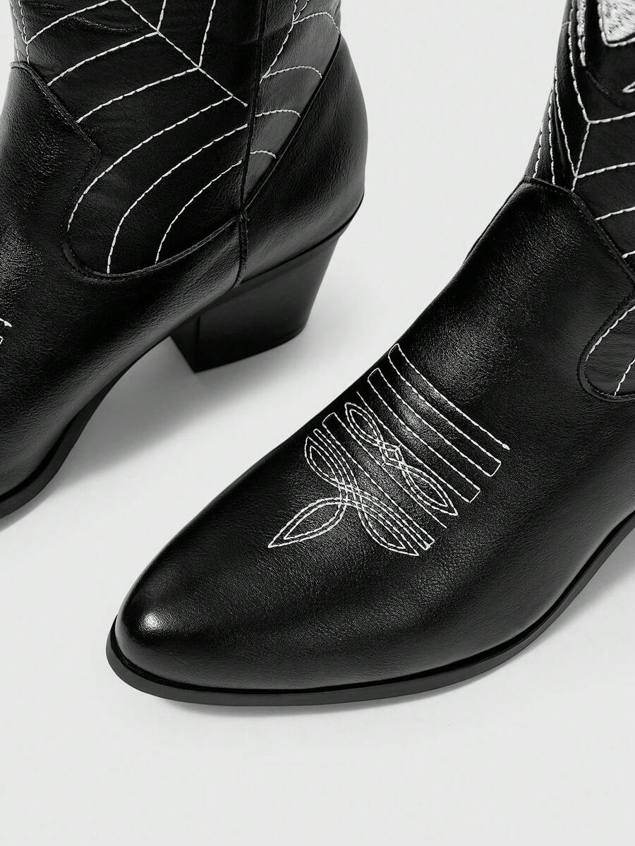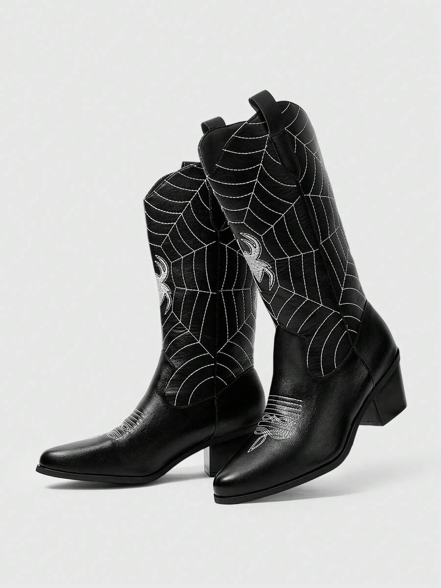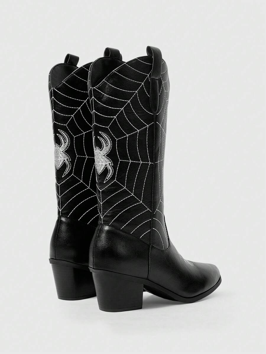 Women's Spider Embroidered Pointed Toe Chunky Heel PU Leather Mid-Calf Boots, Dark Gothic Punk Style For Daily, College