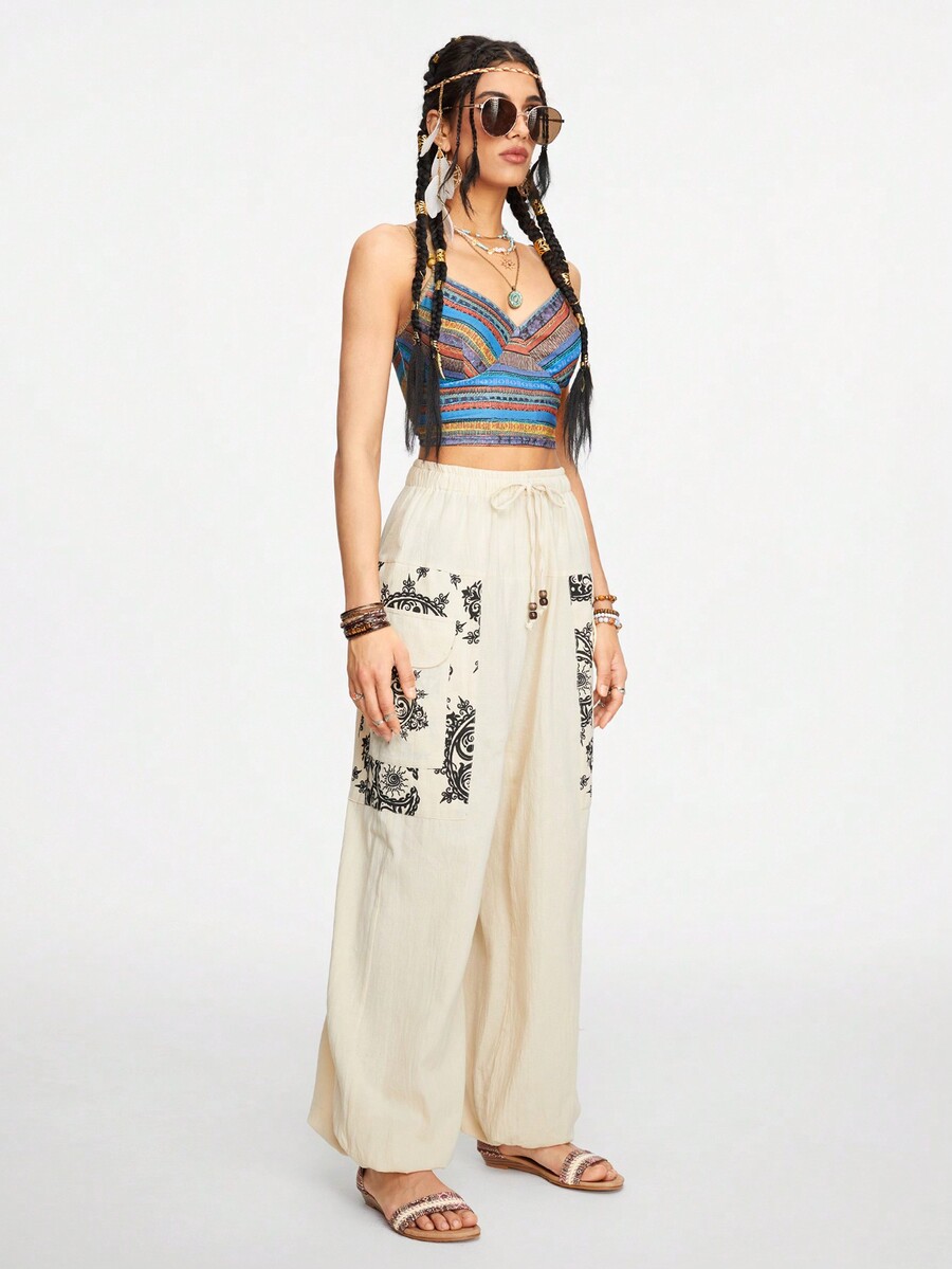 Women's Striped Hippie Wooden Bead Tight Crop Top Top