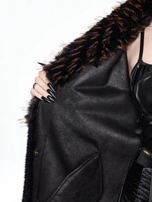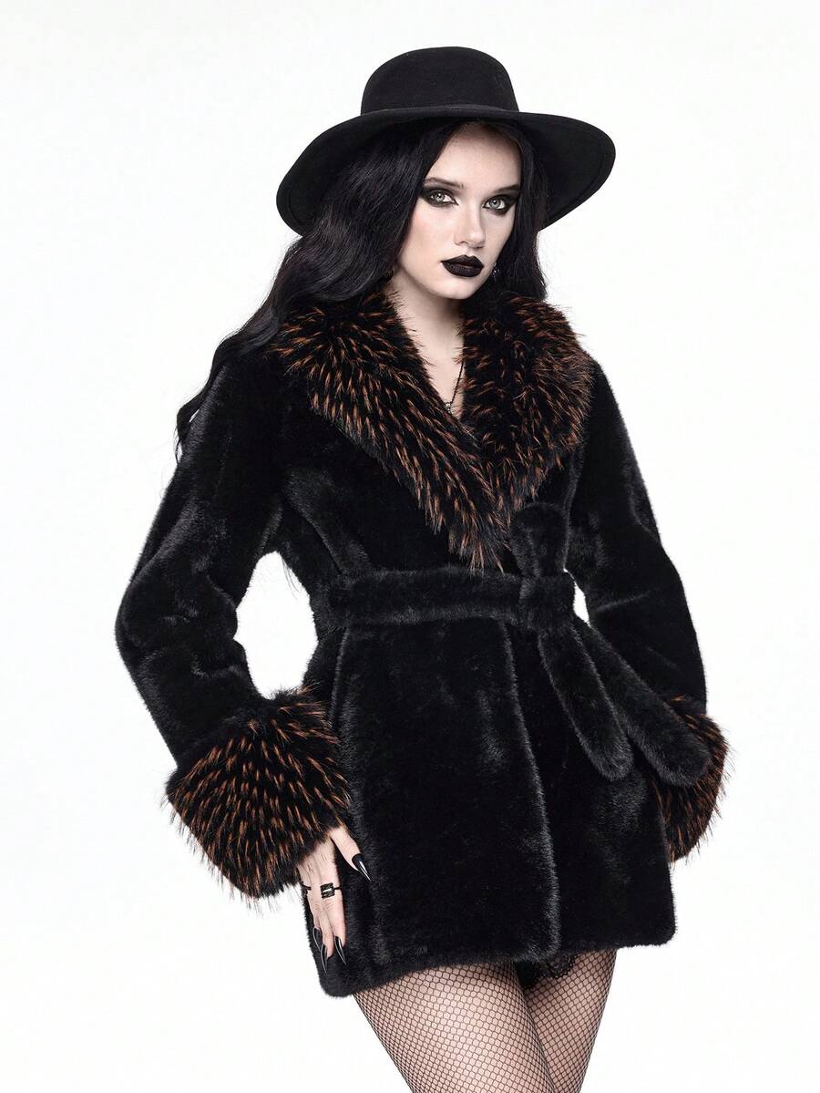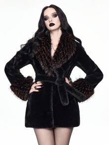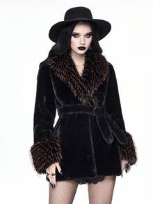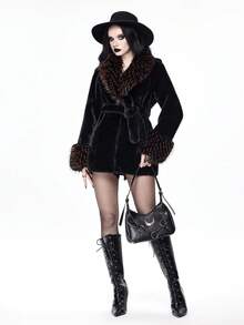 Women's Vintage Patchwork Faux Fur Collar Belt Jacket