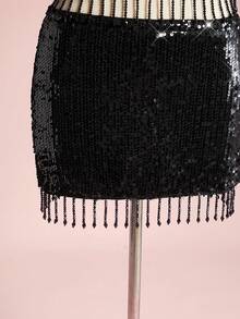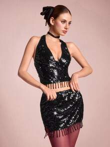 ROMWE Avant Y2K Glam Disco Party Sequin Decor Deep V Crop Top & Mini Skir2 Piecesce Set