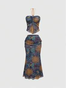 Y2K Hippie Sun & Moon Totem Print Halter Top And Mini Skirt 2 Pieces Set
