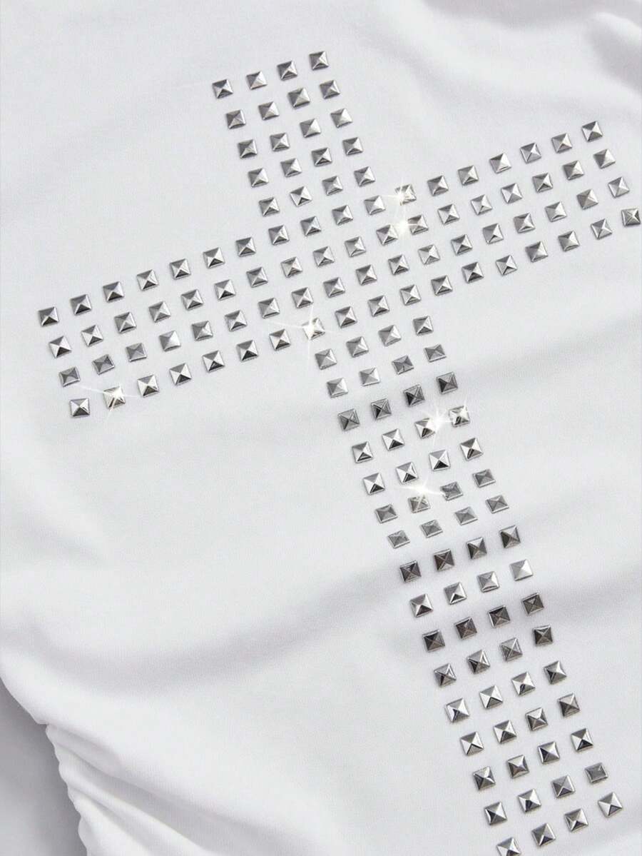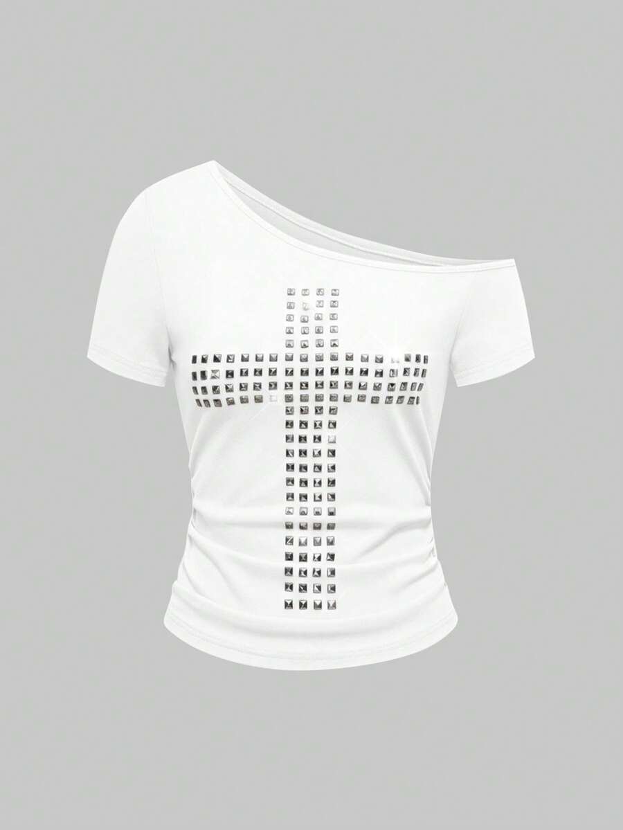 Grunge Punk Y2K Punk Kpop Cross Rivet Oblique Shoulder Fitted Solid Color Versatile T-Shirt