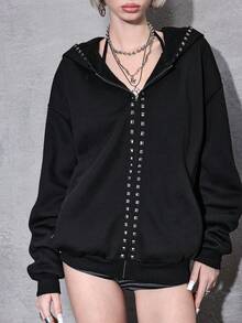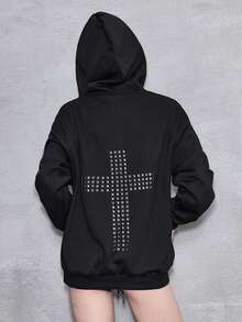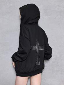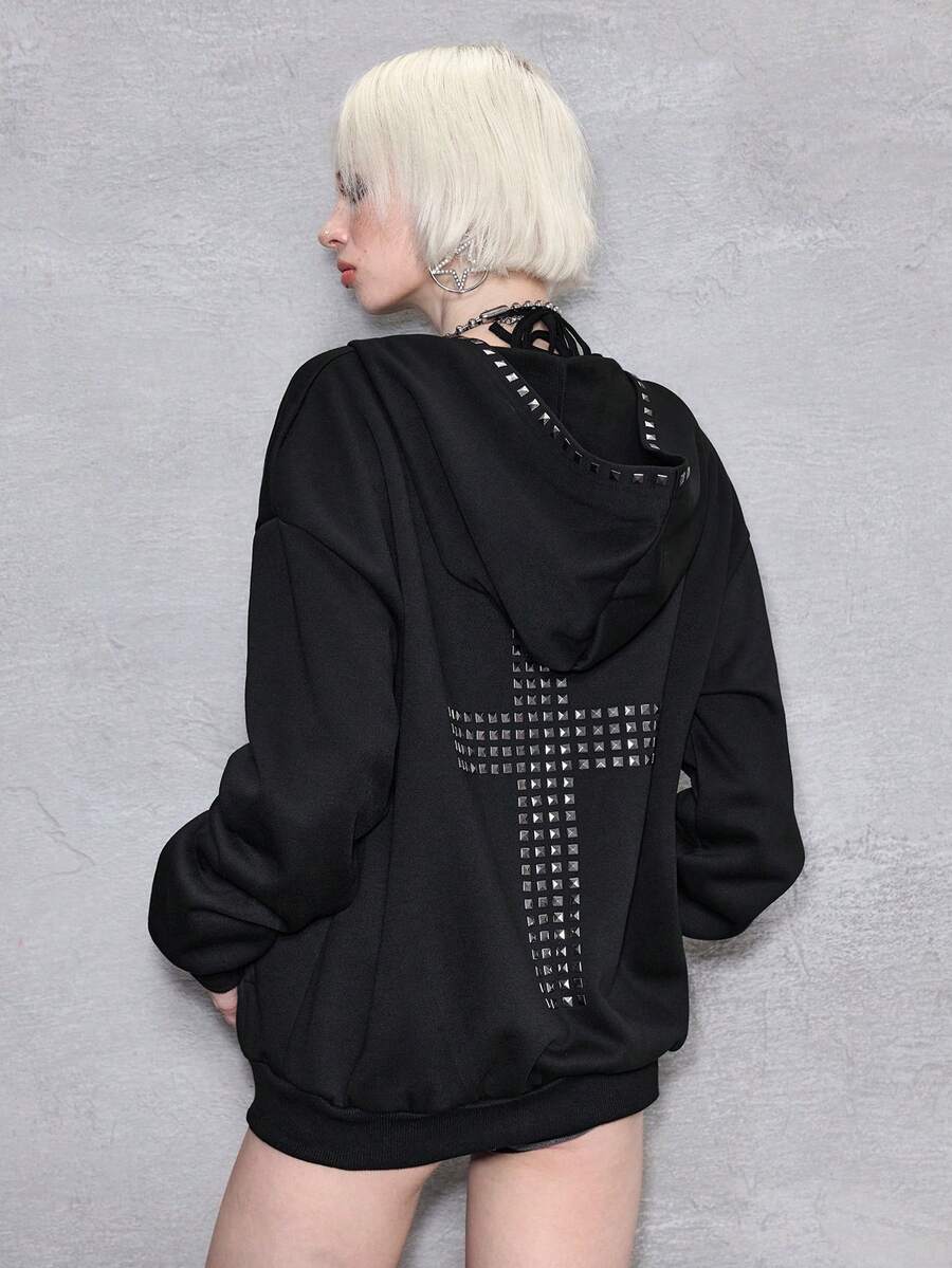 ROMWE Avant Y2K Punk Rivet Cross Back Design Solid Color Casual Loose Sweatshirt