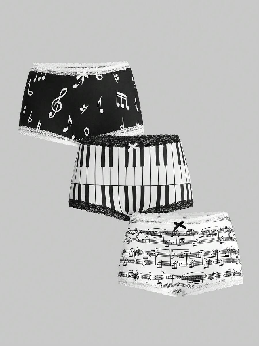 Y2K Retro Music Note & Piano Keyboard Print Lace Trim Low Waist Shorts 3 Pieces Set