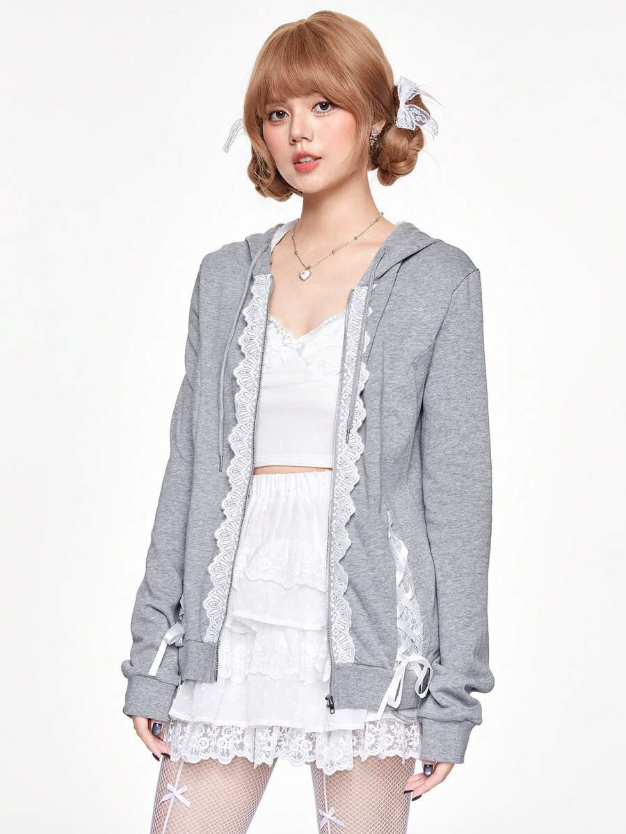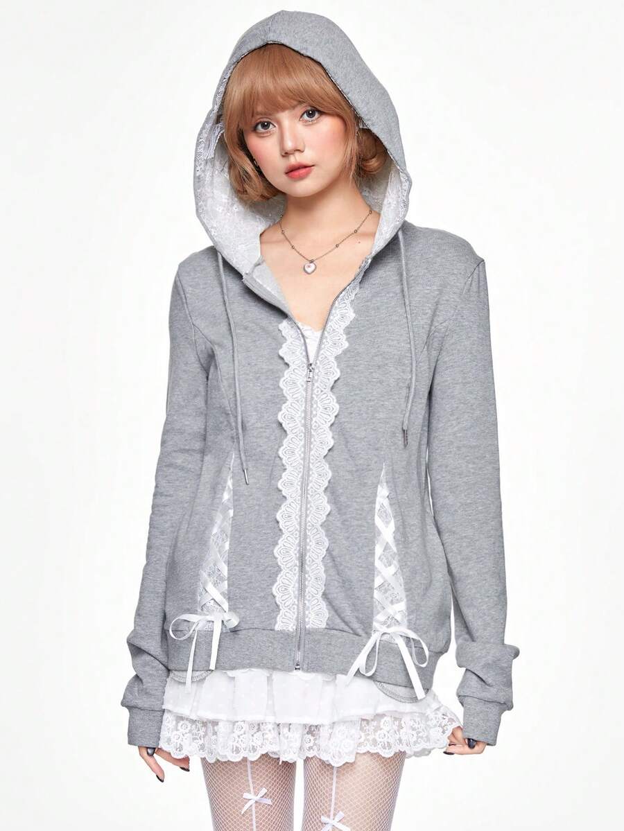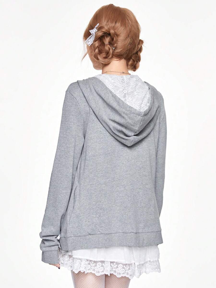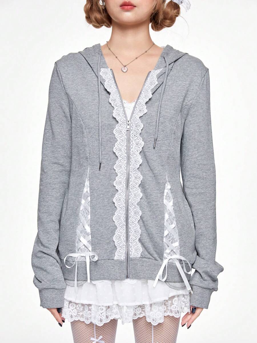 Y2K Style Ballet Girl Casual Contrast Lace Open Front Hoodie
