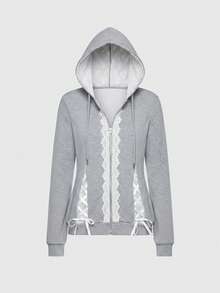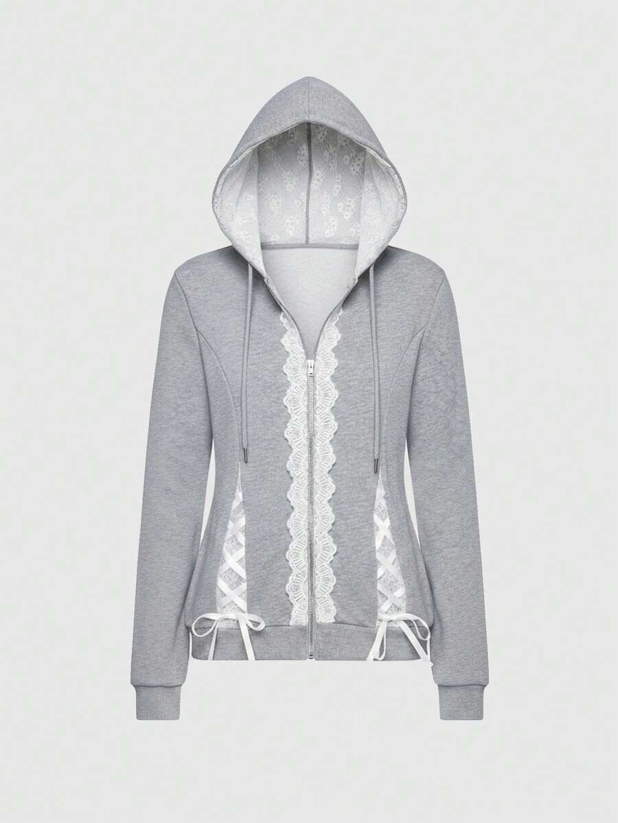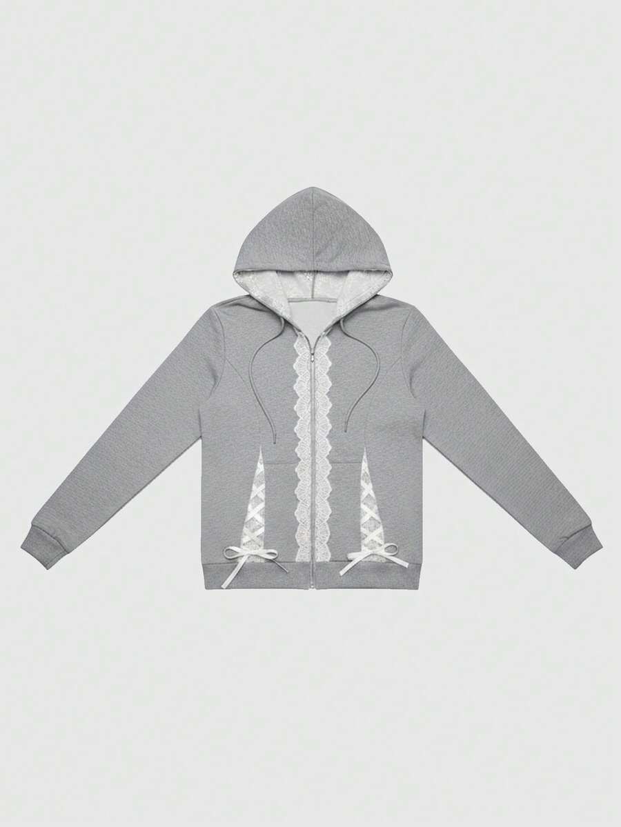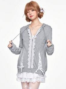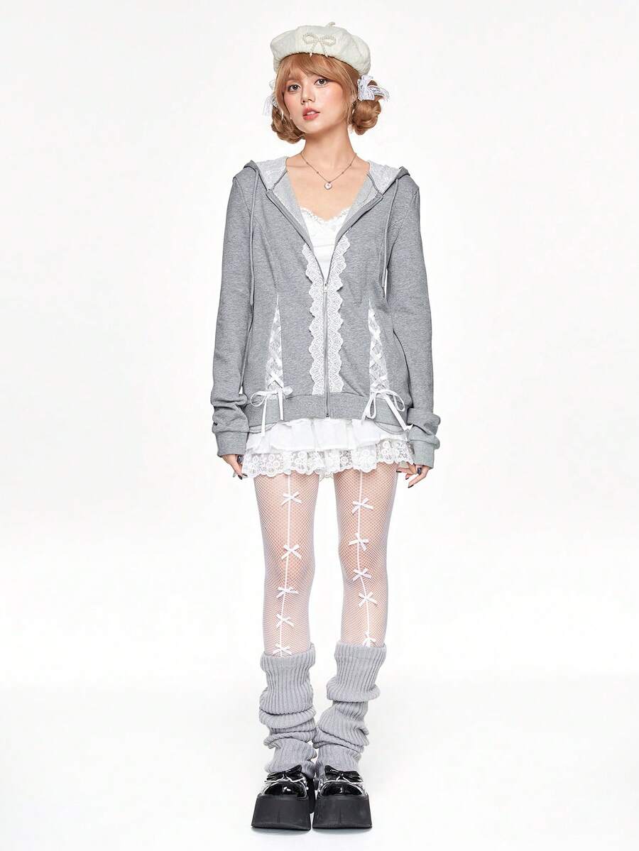 Y2K Style Ballet Girl Casual Contrast Lace Open Front Hoodie