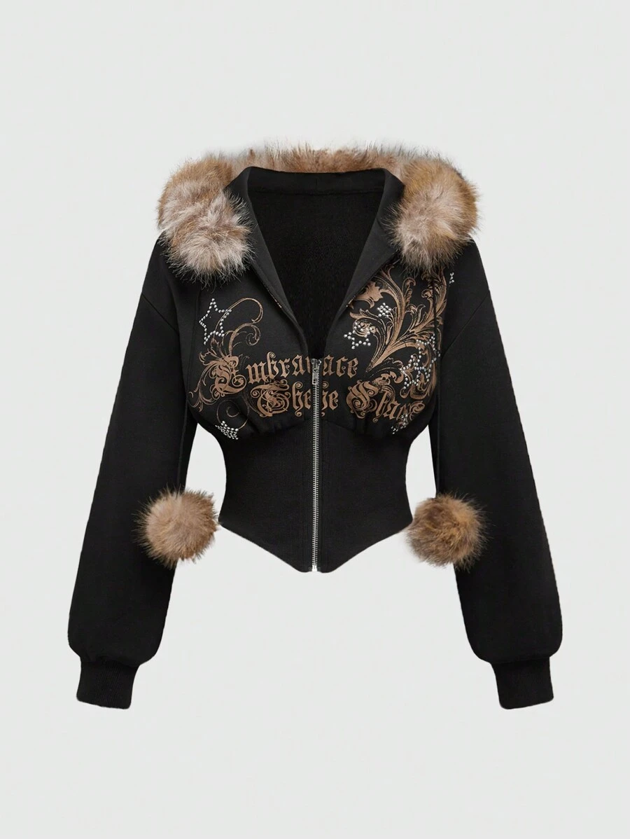 Goth Y2K Subculture Retro Fitted Leopard Print Hooded Sweatshirt, Vintage Vine Print Rhinestone Embellished Plus Size Sweatshirt