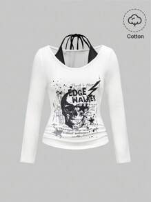 Grunge Punk Y2K Vintage Skeleton & Pentagram Print Women Tight Fit Long Sleeve T-Shirt